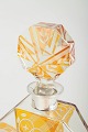 Facetteret Art Deco-karaffel i slebet og dekoreret krystalglas med orange/guldtonet krystalglasur og geometriske ornamenter. Original facetteret prop og sølvmontering.