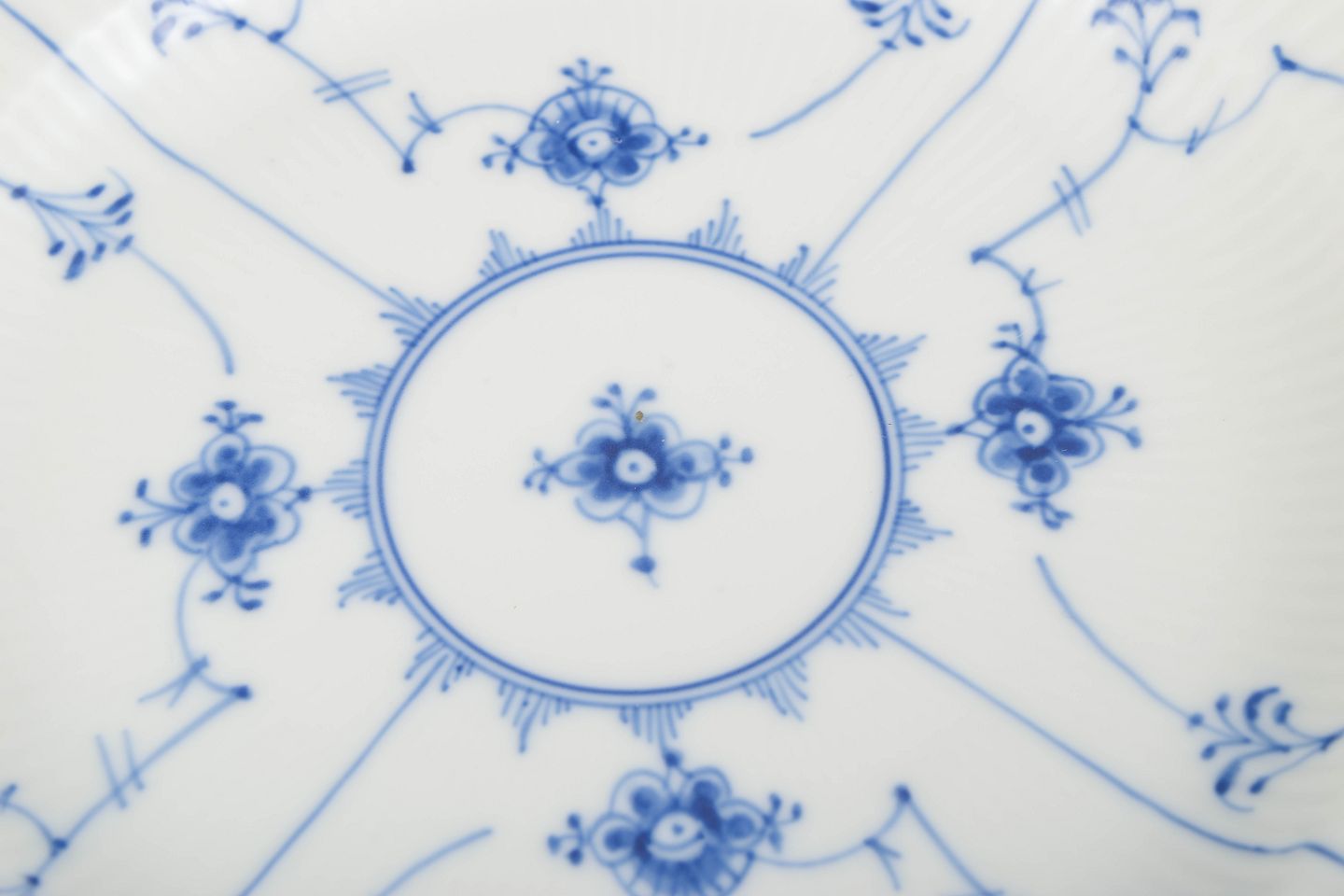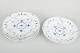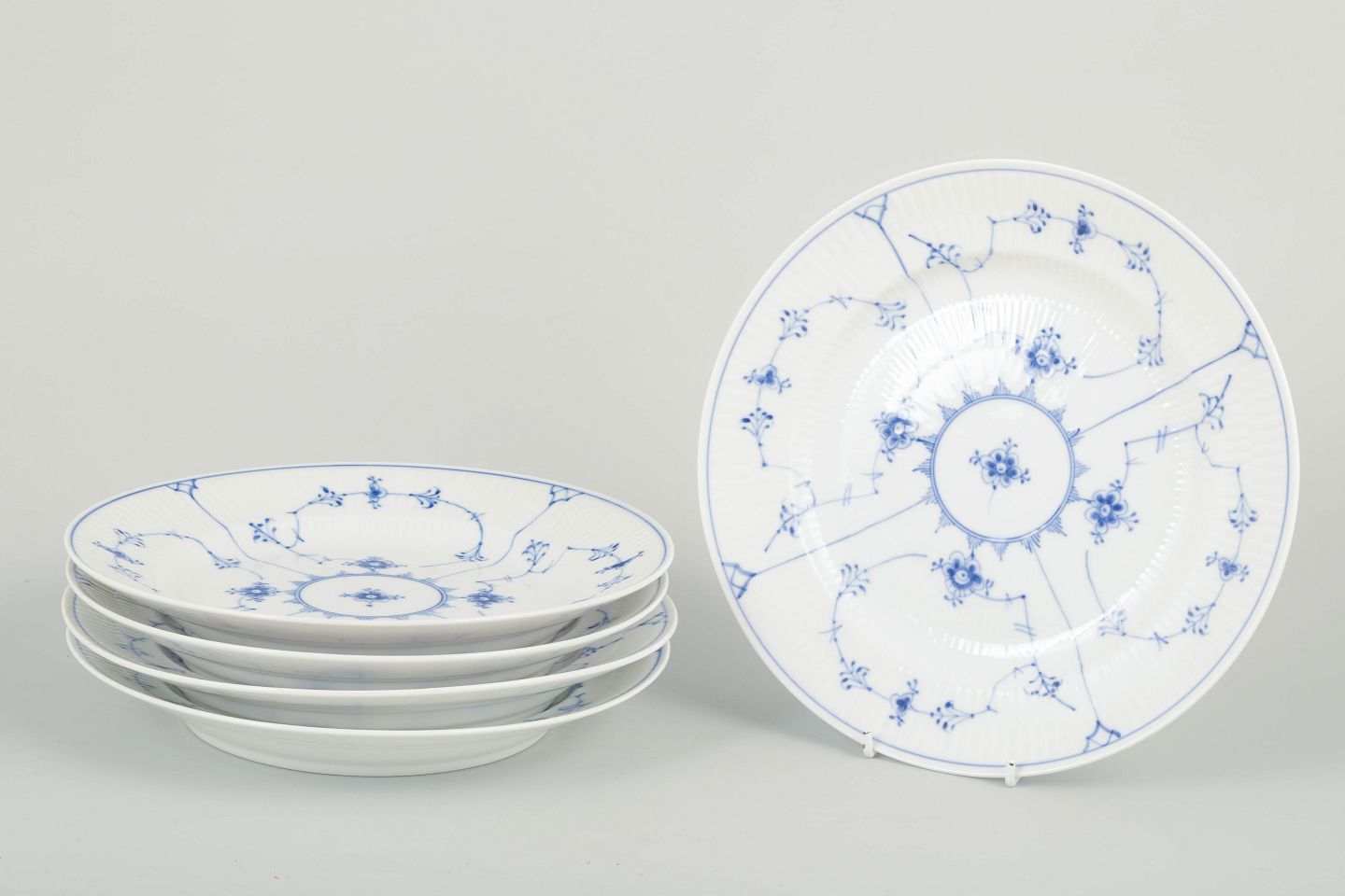 Sæt af fem frokosttallerkener i det klassiske musselmalet mønster, håndmalet i koboltblå på riflet porcelæn. Et tidstypisk og elegant stel fra 1950’erne.