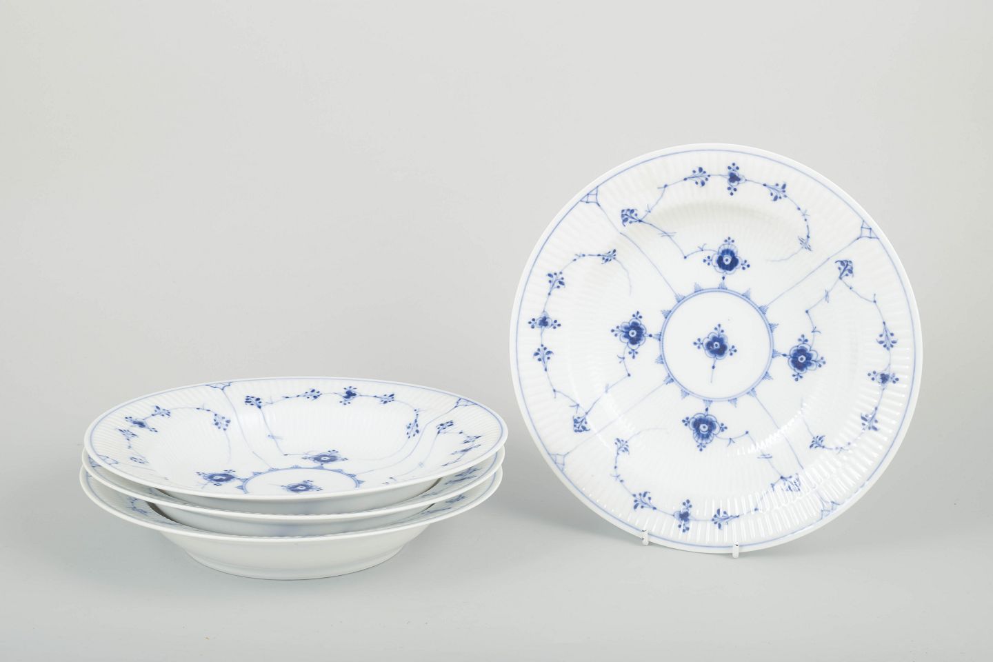 Set of four deep plates in classic “Blue Fluted” porcelain with hand-painted blue decoration and fluted body. A refined and early 20th-century example of Royal Copenhagen craftsmanship.
