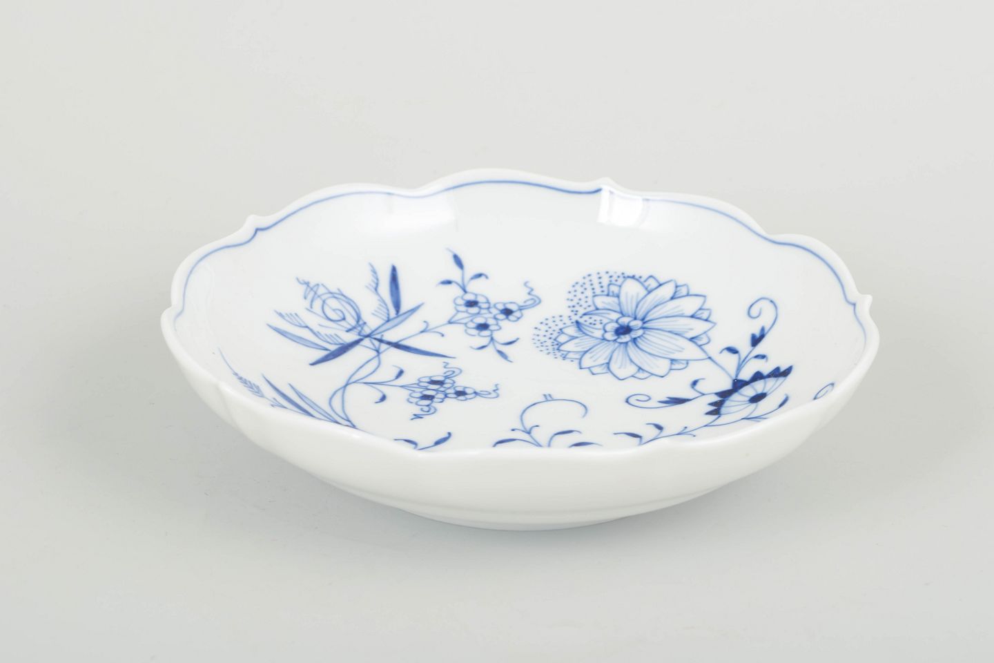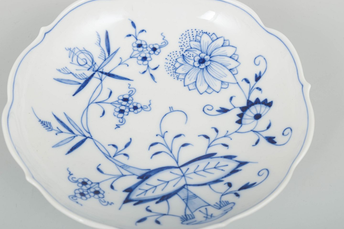 Hand-painted Meissen “Onion Pattern” (Zwiebelmuster) bowl, first quality. The piece features a classic scalloped rim and a richly saturated cobalt-blue decoration, executed on exceptionally fine porcelain and reflecting the highest standards of craftsmanship.
