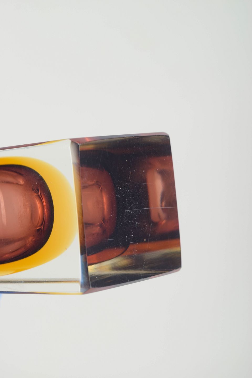 Rectangular Murano vase in layered sommerso glass, featuring a clear outer body, a deep amethyst inner core and warm yellow transitions. An elegant example of 1960s Italian glass design, characterised by sharp lines and strong optical colour effects.
