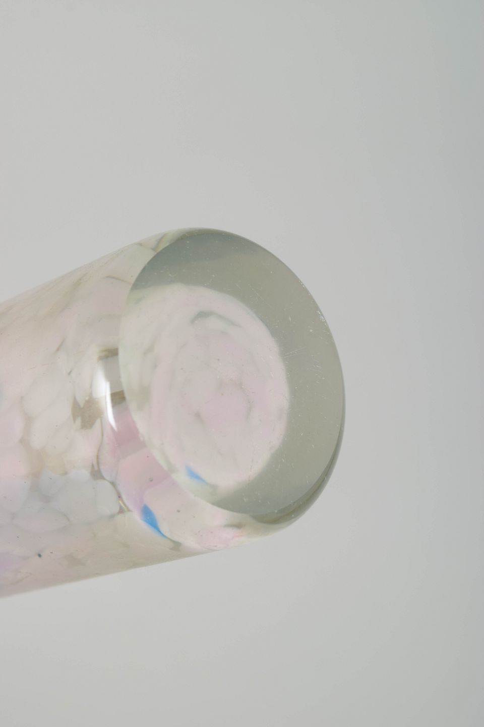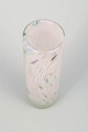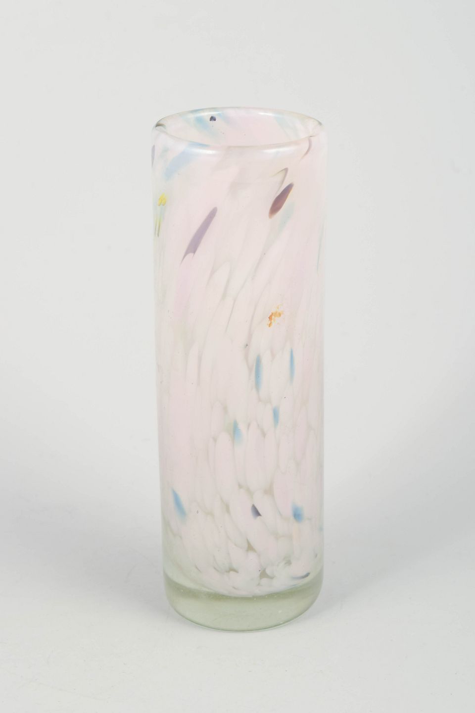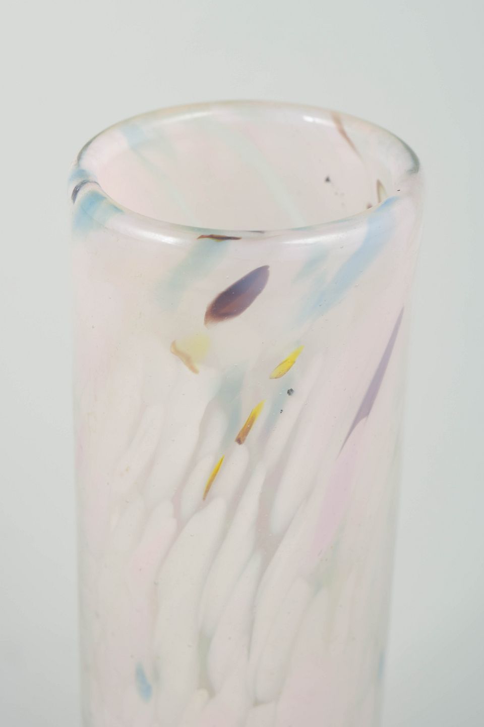 Mouth-blown cylindrical glass vase by Per Lütken featuring soft, feather-like fused colour inclusions in white, pink, blue and touches of amber. The expression is airy and delicate, with a gentle organic movement in the colours, characteristic of Lütken’s more experimental decorative pieces.
