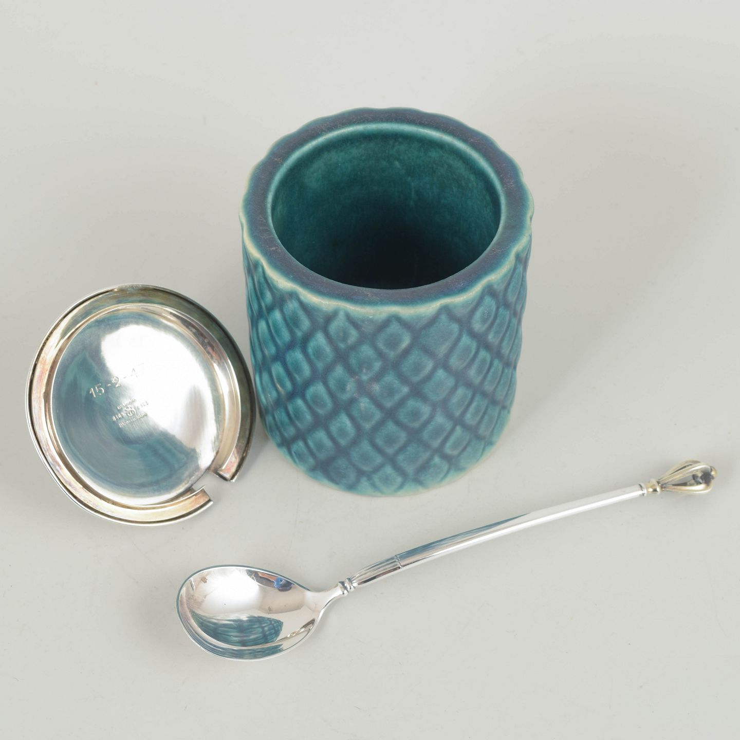 Marmeladekrukke med tretårnet låg og tretårnet sølvske, midt 1900-tallet.