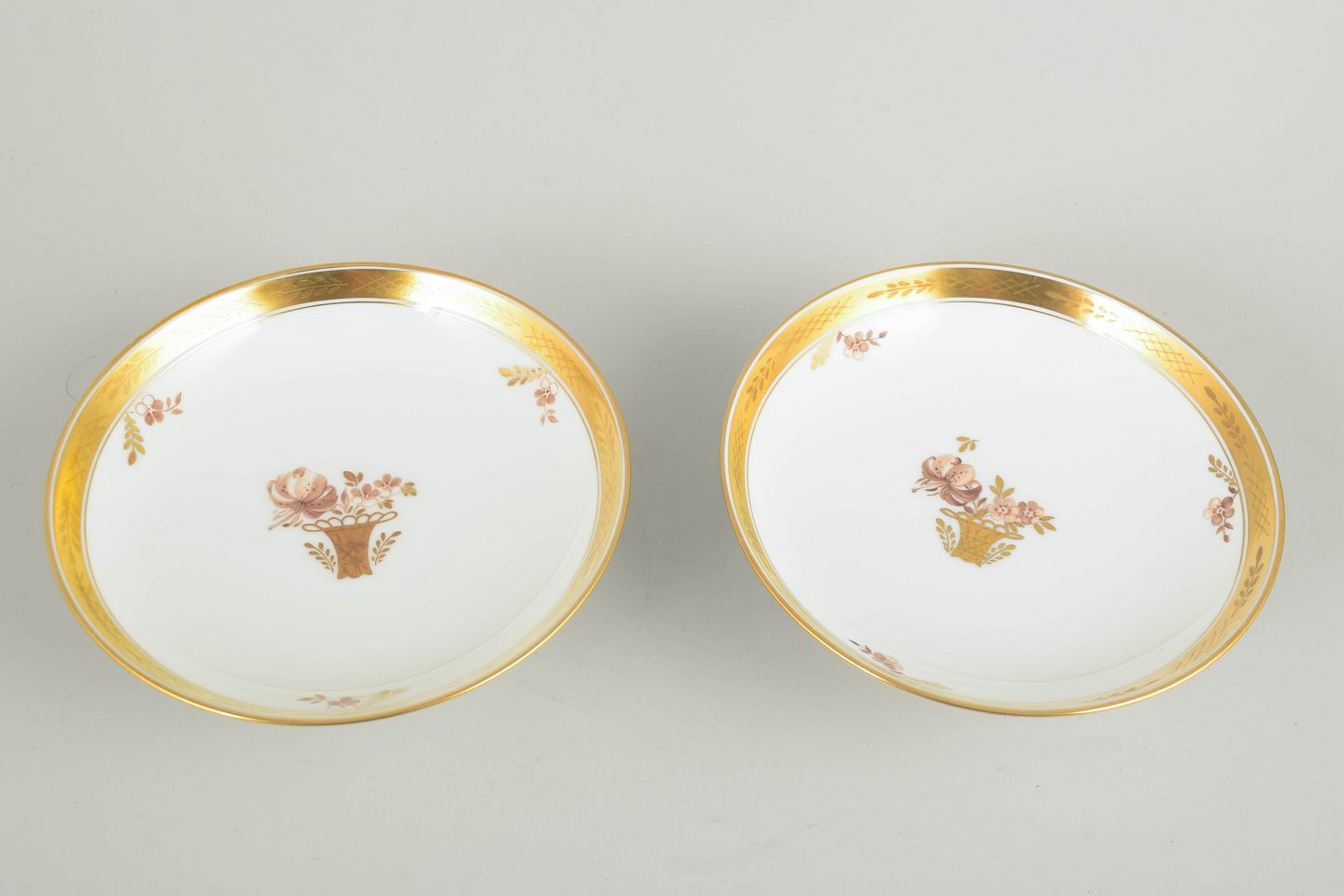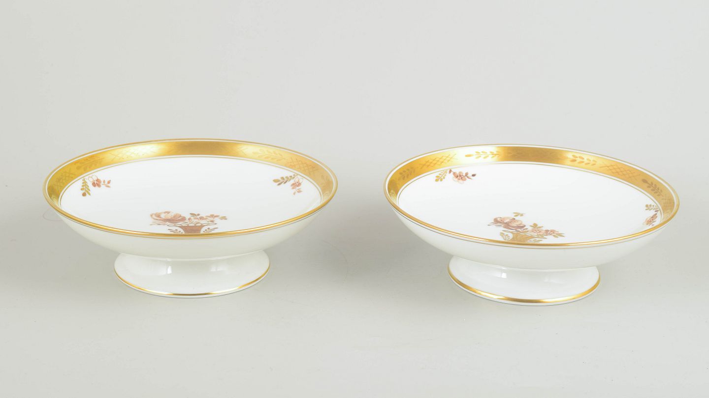 Beautiful pair of porcelain compotes from Royal Copenhagen’s “Golden Basket” series, model 595/9269. Both with raised foot, wide gilded rim and hand-painted floral basket motif.