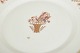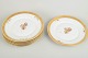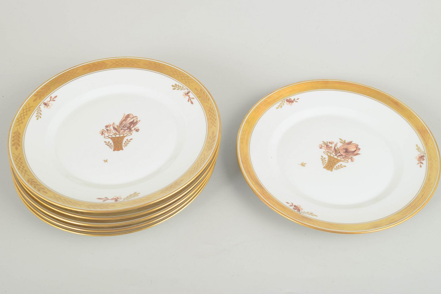 Set of six lunch plates in porcelain from Royal Copenhagen’s “Golden Basket” series. Classic white porcelain with gilded rim and the characteristic hand-painted floral basket motif.