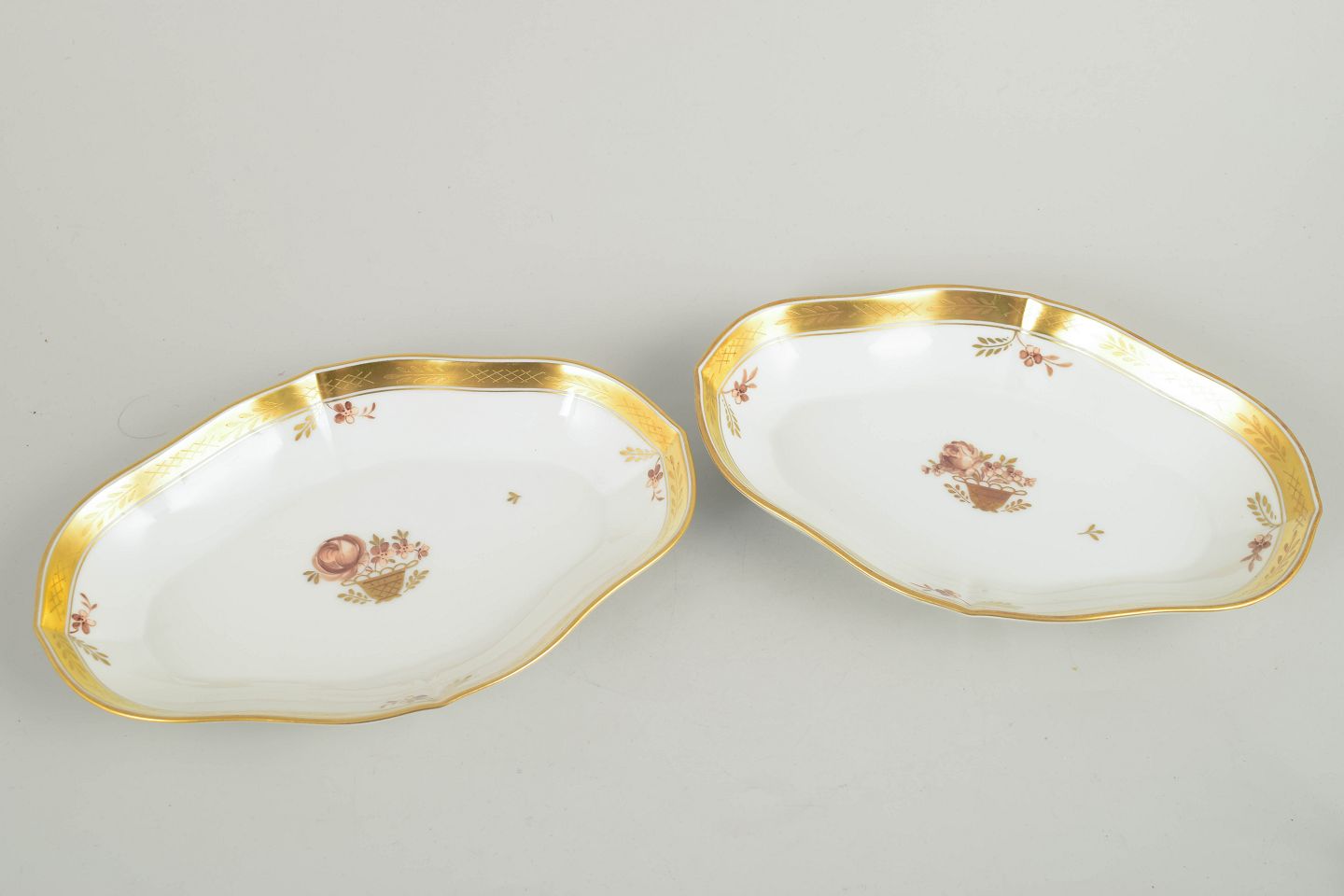Set of two elegant porcelain cake dishes from Royal Copenhagen’s “Golden Basket” series, model 595/9626. Both in 1st quality with gilded rims and hand-painted floral decoration.