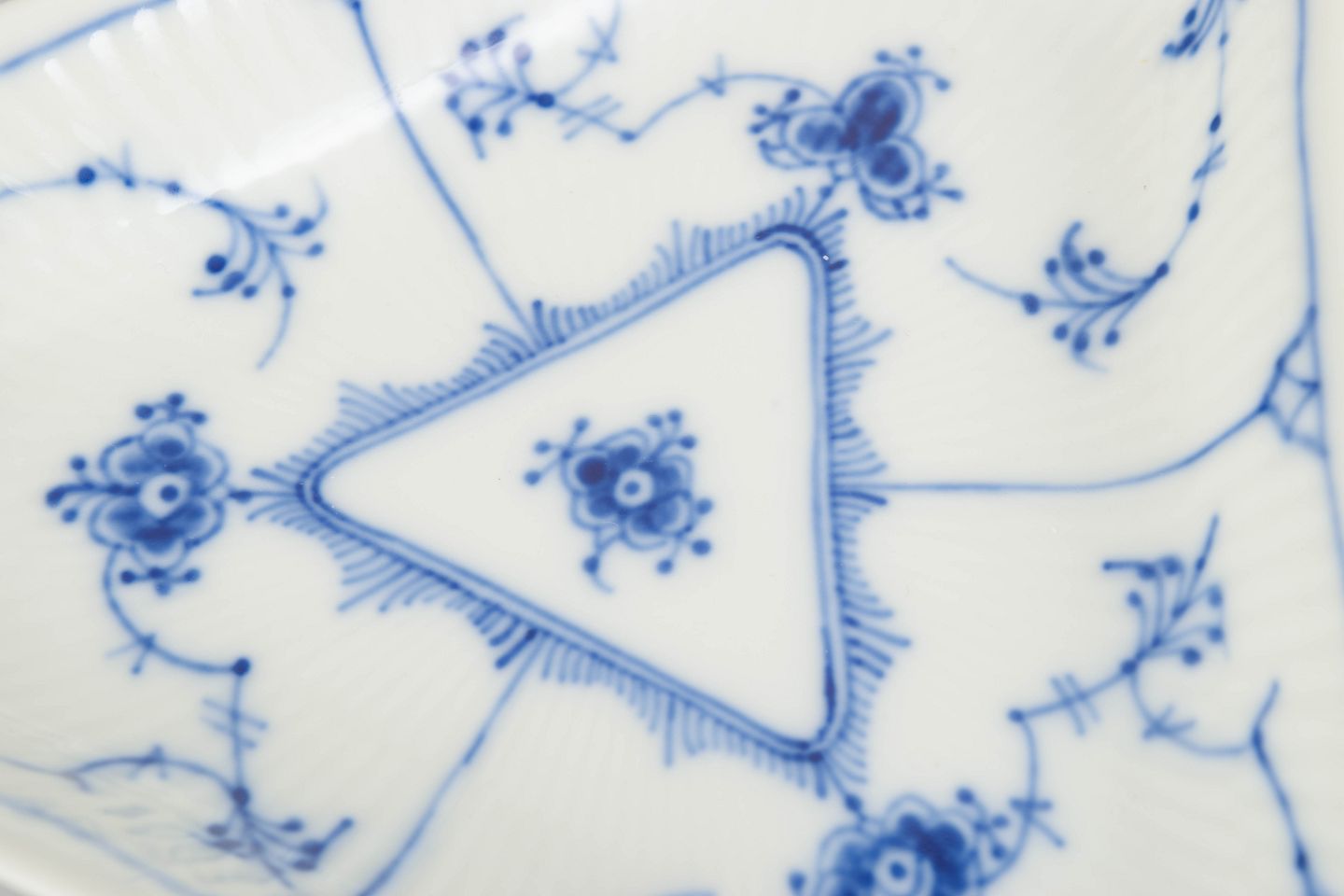 Dekorativ trekantet asiet i Musselmalet Riflet, udført i riflet form med blødt afrundede hjørner og dekoreret med håndmalet koboltblå underglasur. Asietten har et centralt trekantet spejl omgivet af den klassiske musselmalede dekoration og fremstår som en elegant og relativt sjældent forekommende mindre serveringsdel.