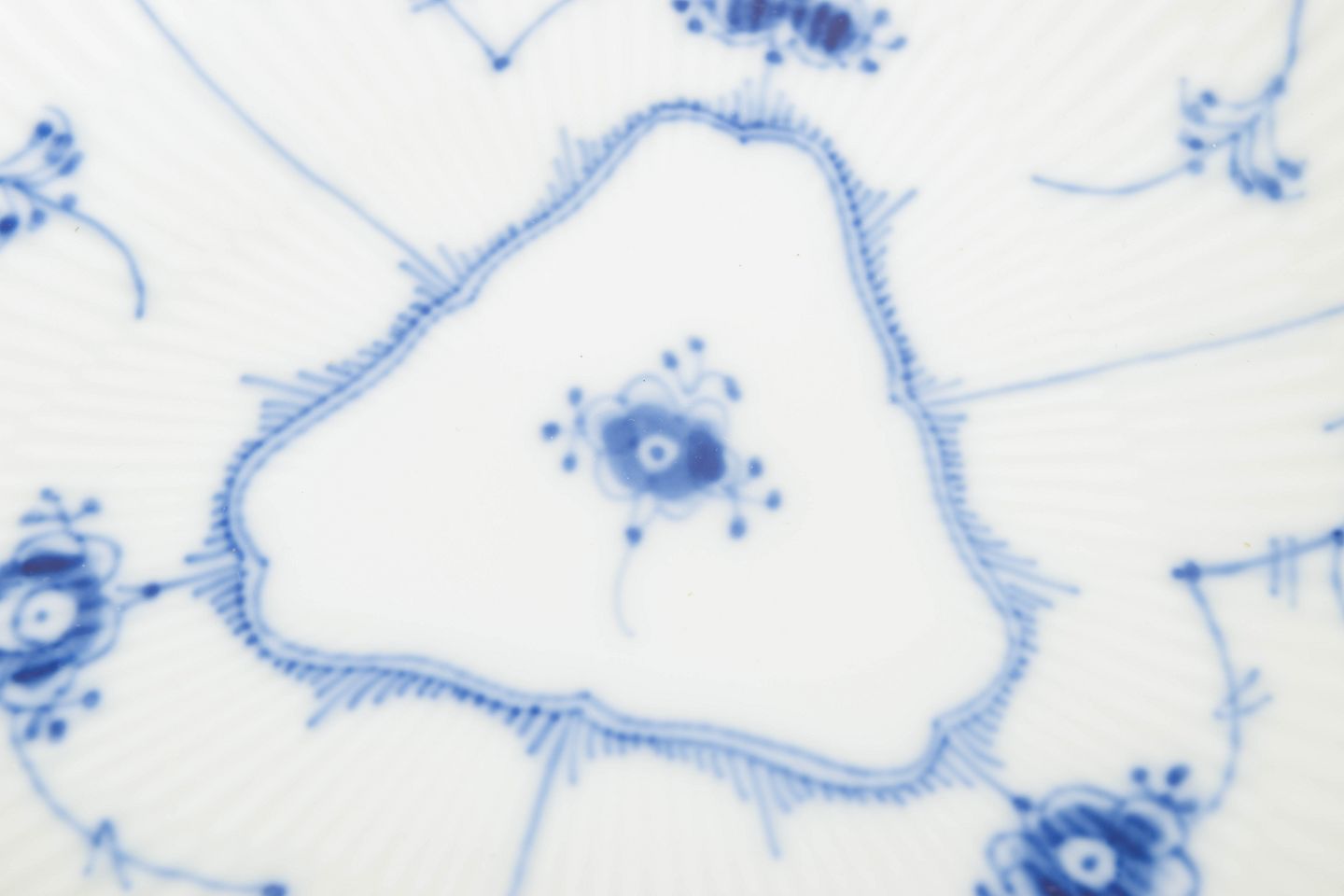 Musselmalet Riflet blev introduceret i 1775 og er Royal Copenhagens ældste og mest traditionsrige stel. Dekorationen er inspireret af kinesisk blå-hvid porcelæn og kendetegnes af sin stringente opbygning, rytmiske penselføring og fine håndmalede detaljer. Mere formmæssigt markante serveringsdele som dette trekantede fad blev produceret i mindre oplag og afspejler fabrikkens fortsatte udvikling af klassiske stel i midten af det 20. århundrede.