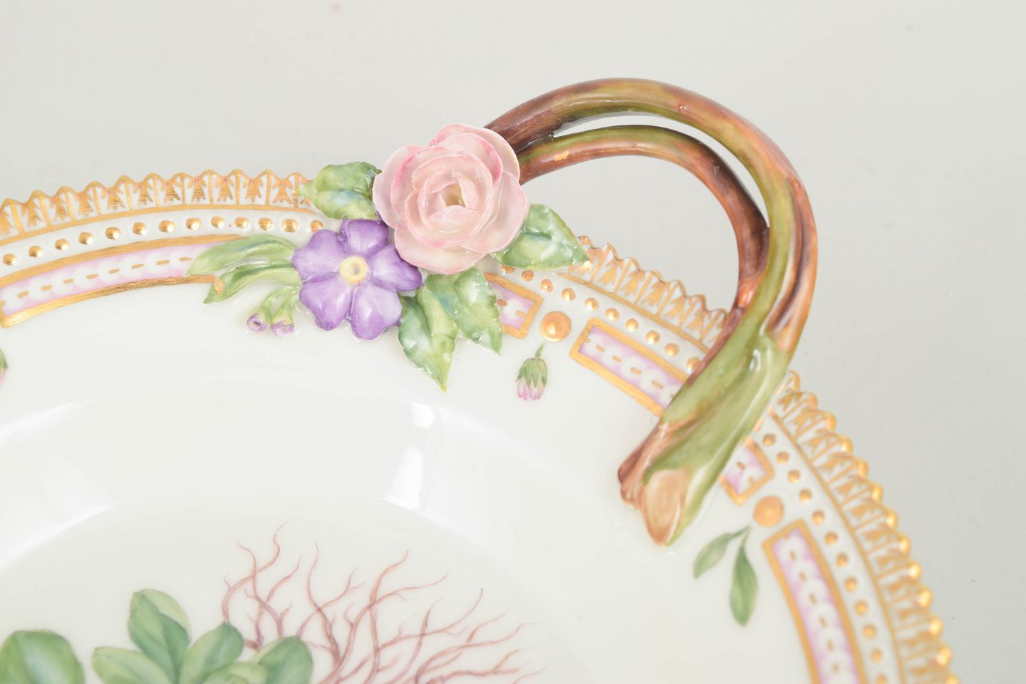 Elegant dish with handle from the iconic Flora Danica service, hand-painted with a botanical motif derived from the Flora Danica publication. The dish is executed in the service’s characteristic refined form with a decorated rim and pronounced handle, combining functionality with a decorative appearance. Suitable for serving or presentation.