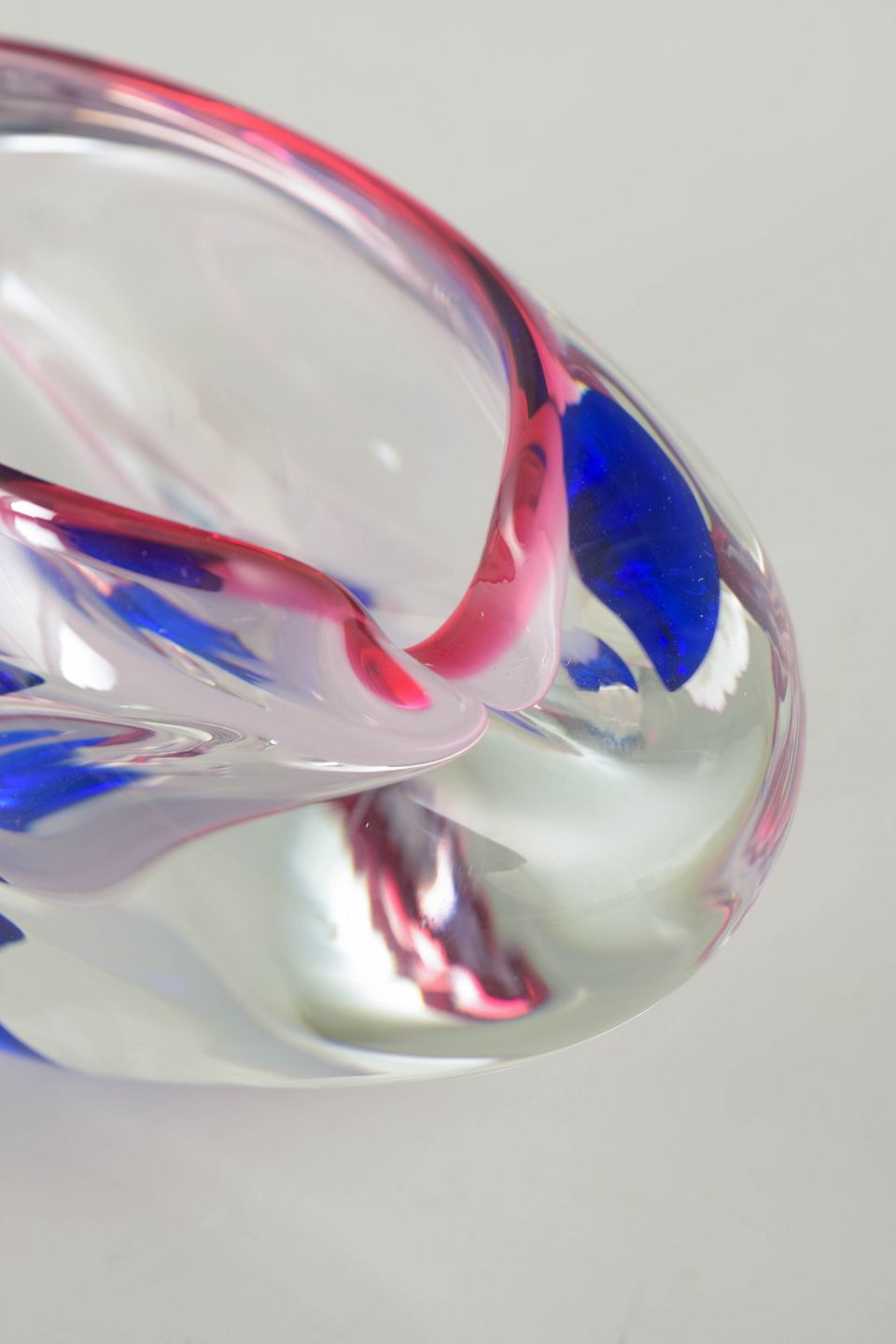 Organic-shaped bowl in mouth-blown art glass using the layered sommerso technique. Clear glass with encased blue and pink colour fields, creating depth and a distinctive floating play of colour. Typical Murano work from the 1960s/70s with soft, sculptural lines.