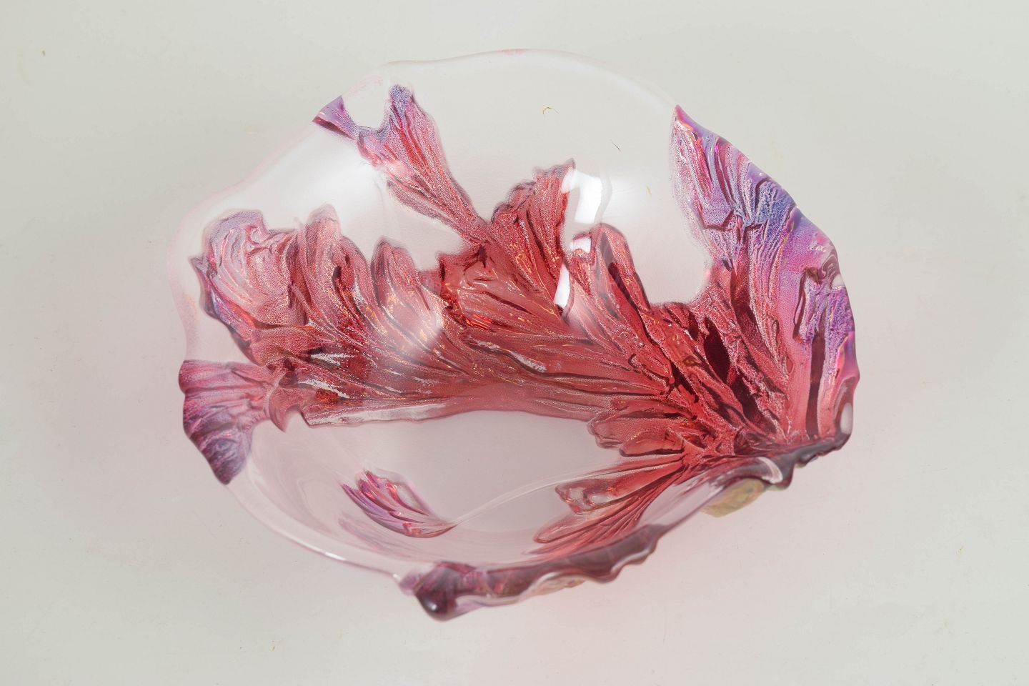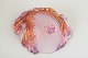 Mouth-blown art glass bowl with an organic, gently undulating form and a softly upturned rim. Decorated with applied, leaf- or petal-like elements in pink, purple, and amber tones, creating a lively, sculptural presence.