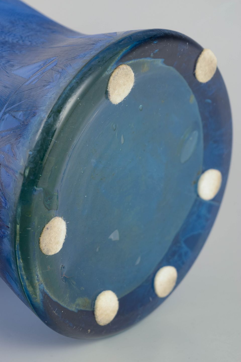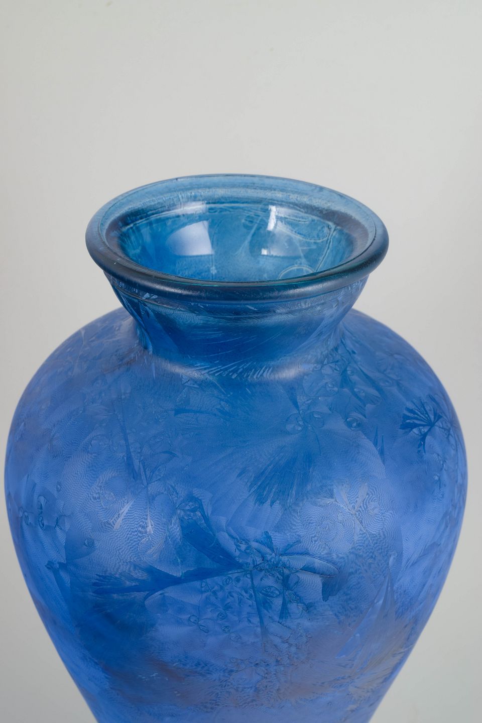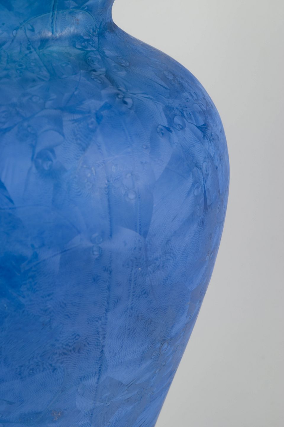 Large free-blown floor vase in blue art glass with a dynamic, cloud-like internal structure and softly matte surface. The well-balanced silhouette with a broad body and gently tapered neck is characteristic of European studio glass from the period.