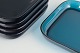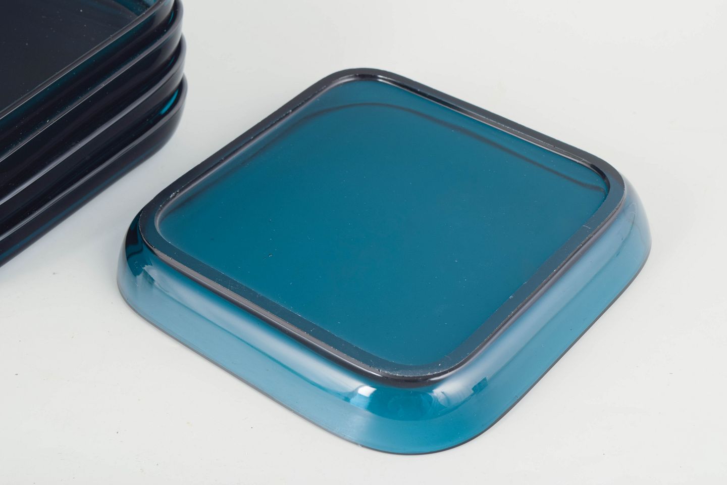 Set comprising five shallow square dishes in handmade art glass with softly rounded corners and a transparent blue-green tone. A clean, restrained design with a gently raised rim and polished surfaces, where the light emphasises the depth and colour of the glass.