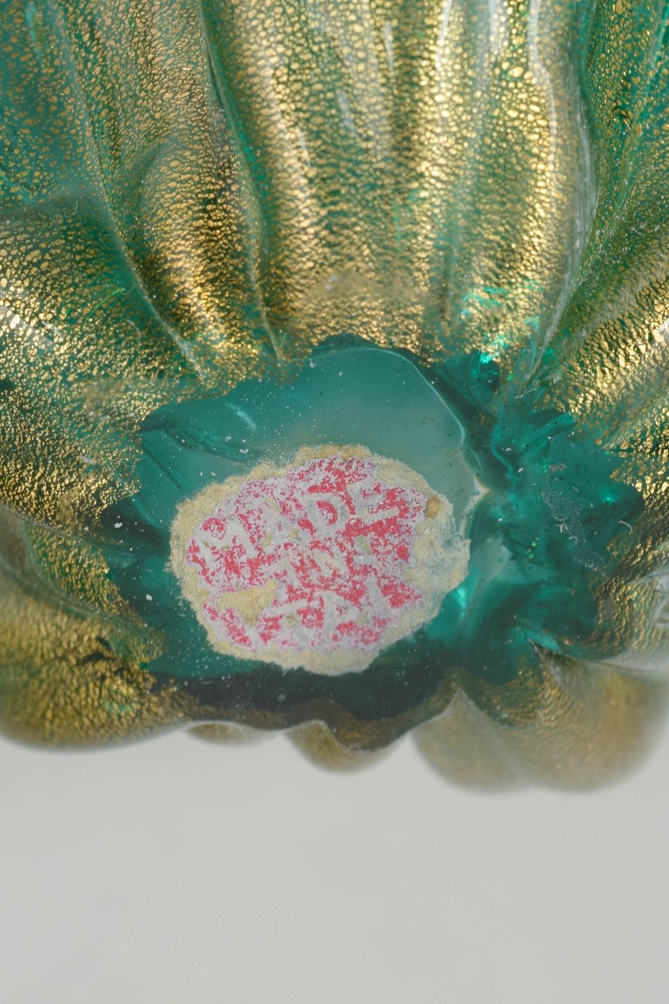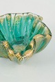 Decorative bowl in mouth-blown glass with an organic, undulating form and rich decoration in turquoise-green tones combined with golden inclusions, creating a vivid and tactile expression. The surface displays a refined interplay between transparent glass and shimmering particles, characteristic of Murano glass production in the mid-20th century. The model belongs to a tradition of small art glass bowls made as individual decorative objects.