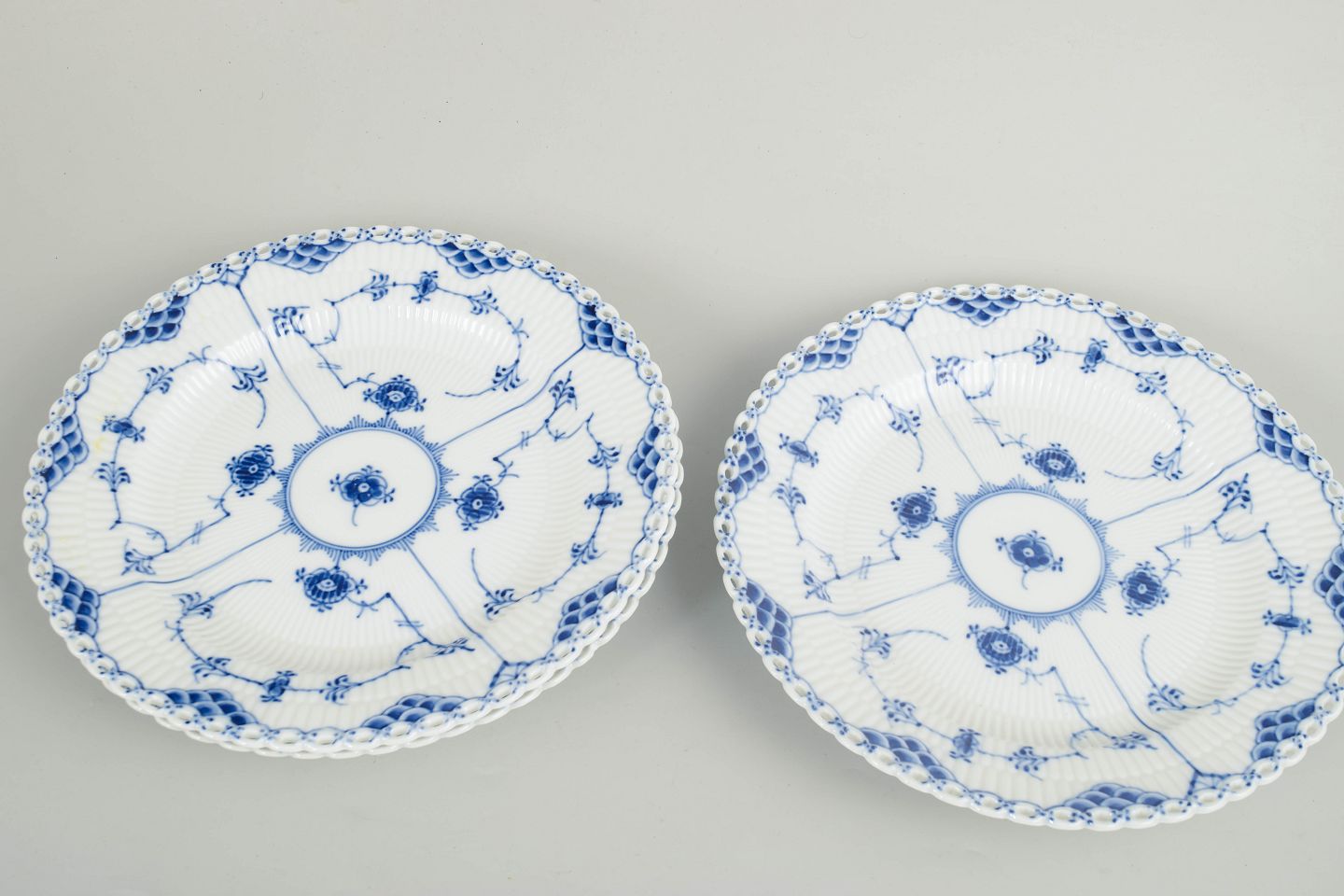 Royal Copenhagen, Blue Fluted Full Lace dinner plates, set of 3. Model 1/1084.