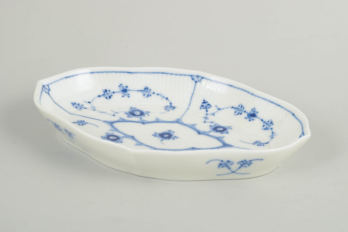 Oval dish in glazed porcelain with hand-painted underglaze decoration in the classic Blue Fluted Plain pattern. Model 1/147.