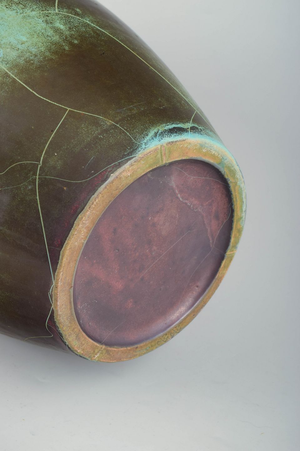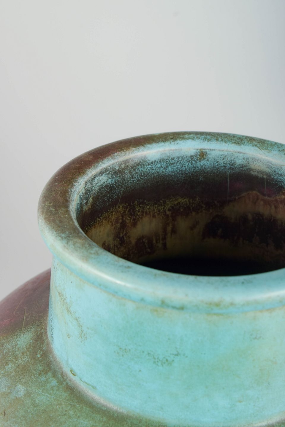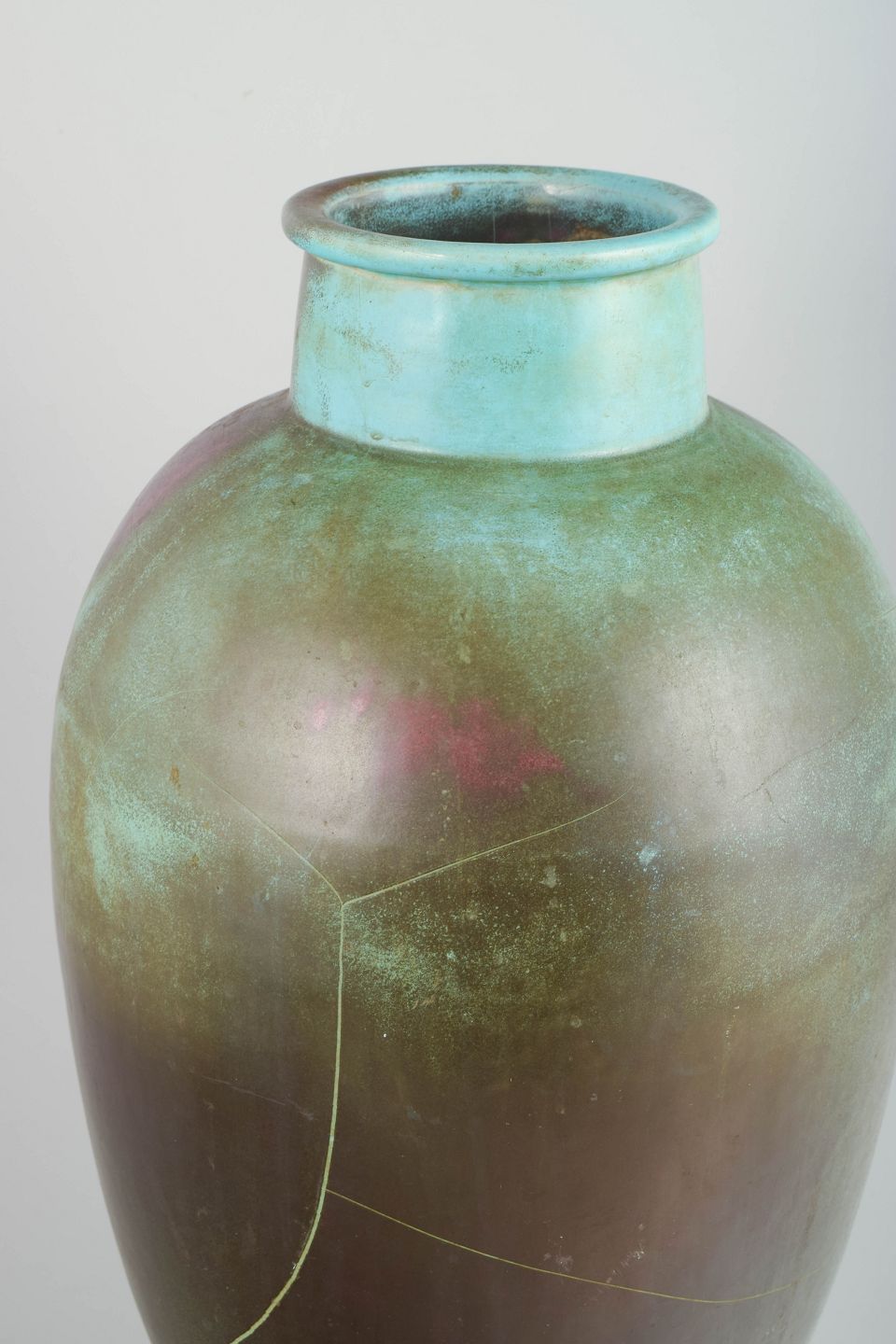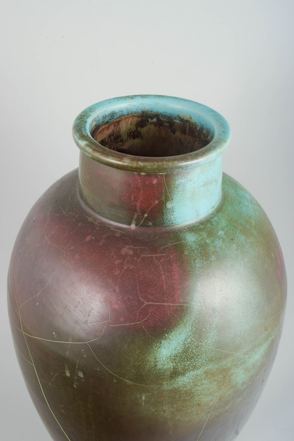Monumental, balusterformet gulvvase i keramik med dyb, iriserende overflade i mørke grønlige og vinrøde toner. Den høje, slanke silhuet og den markante hals giver et elegant Art Deco-præg.