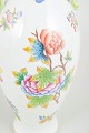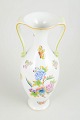 Stor balustervase i hvidt porcelæn med håndmalet dekoration i mønsteret Queen Victoria, udført med farverige blomster og sommerfugle samt guldkant.