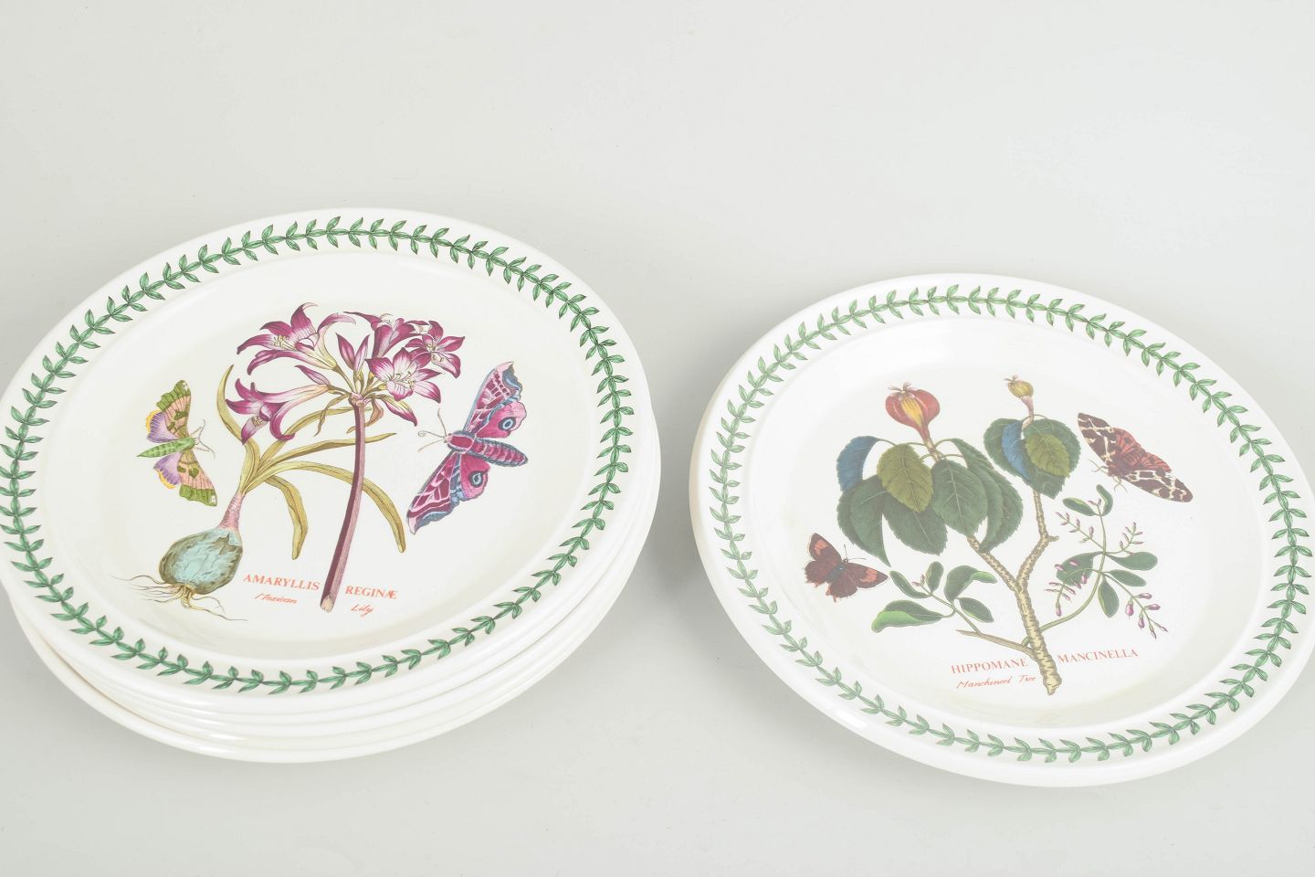 Sæt med 6 store middagstallerkener i fajance fra Portmeirion, dekoreret i “The Botanic Garden” serien med botanisk motiv og karakteristisk grøn bladbort.
