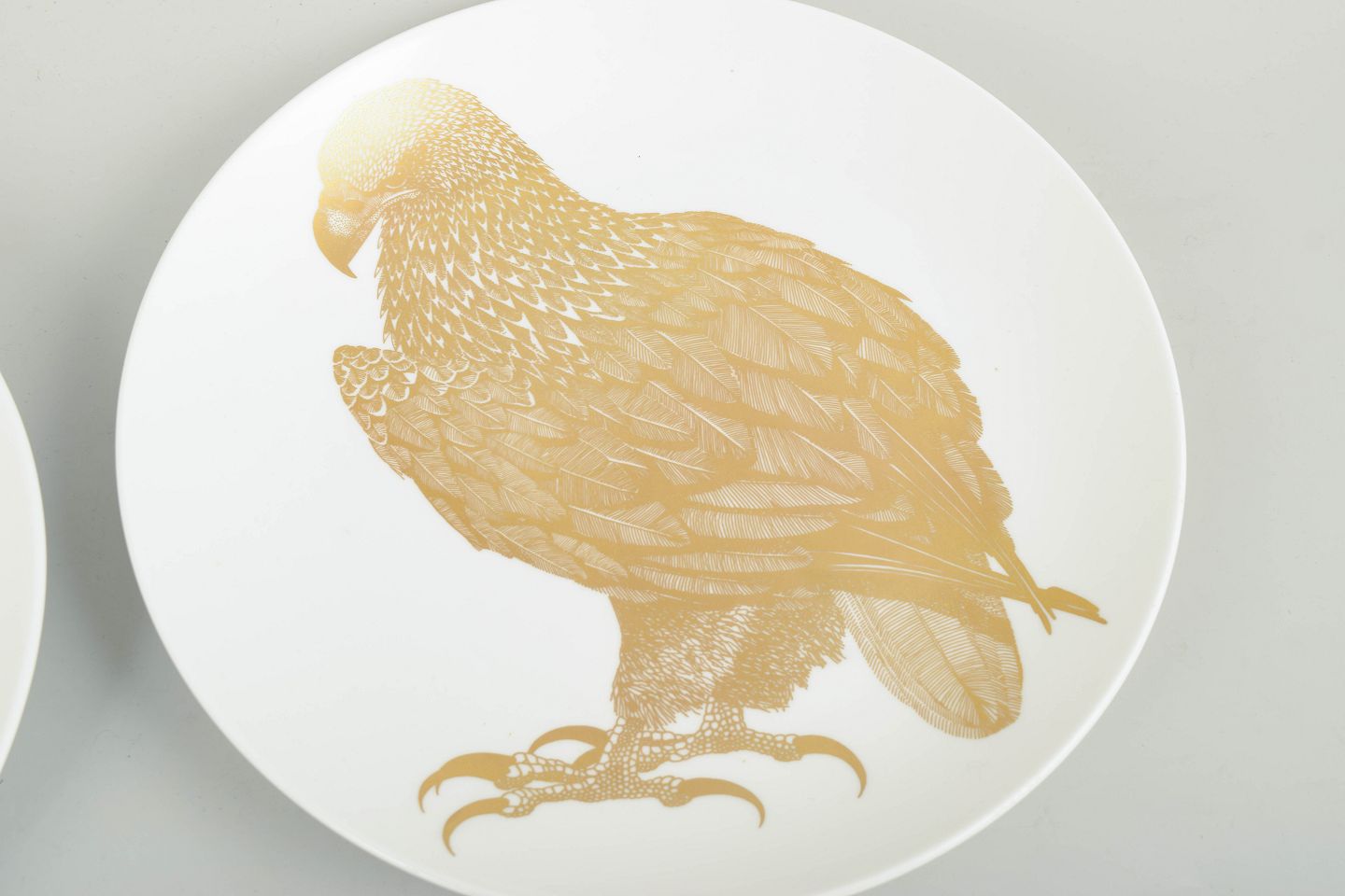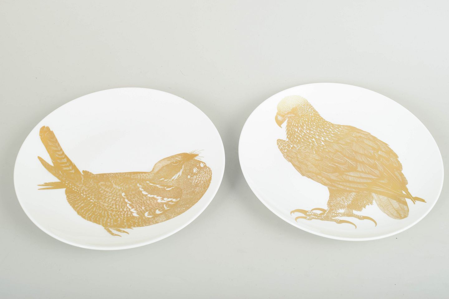 Set of two porcelain collector’s plates decorated with bird motifs in gold. The plates belong to the “Arter i fara” series; the specific model is identified on the reverse with printed title, series number and species description. Produced in limited numbers during the 1980s.