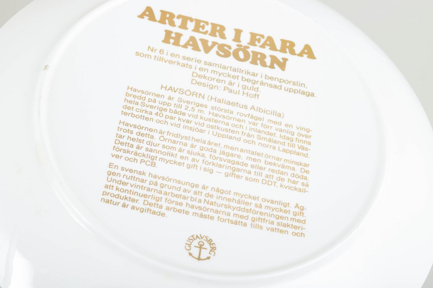 In the 1980s, Gustavsberg introduced the “Arter i fara” series focusing on endangered species. The series is recognised for its finely rendered wildlife motifs in metallic decoration combined with informative reverse text and was produced in relatively limited editions, making it collectible within Swedish porcelain.