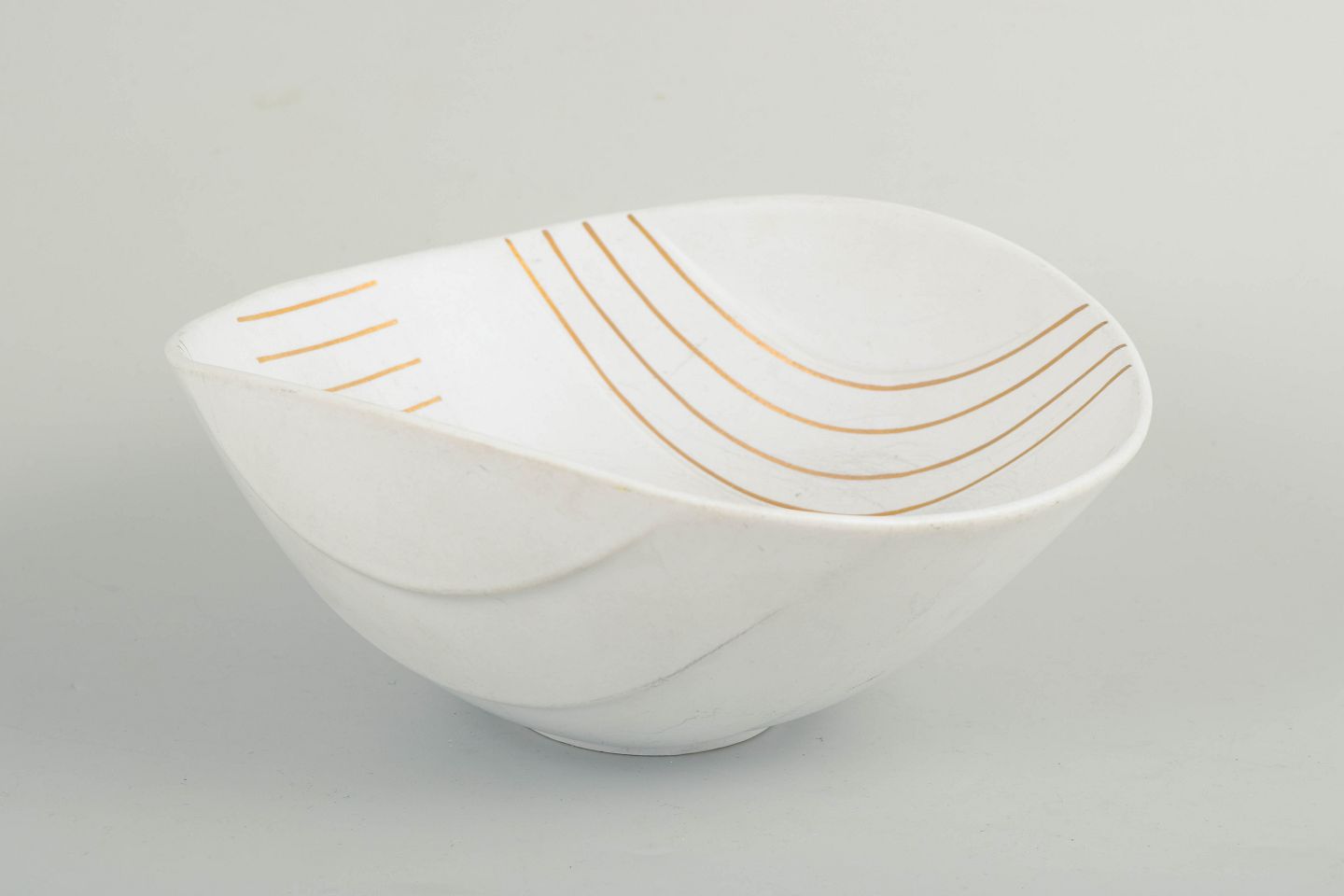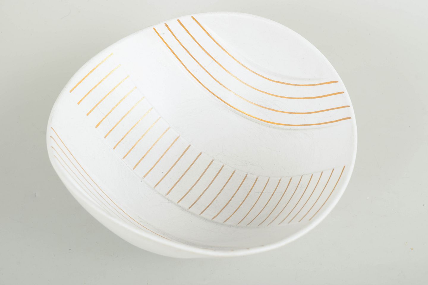 Large, organically shaped bowl in glazed ceramic with a subtly undulating relief and fine gilt decoration. Studio hand work, “Guldsurrea”.