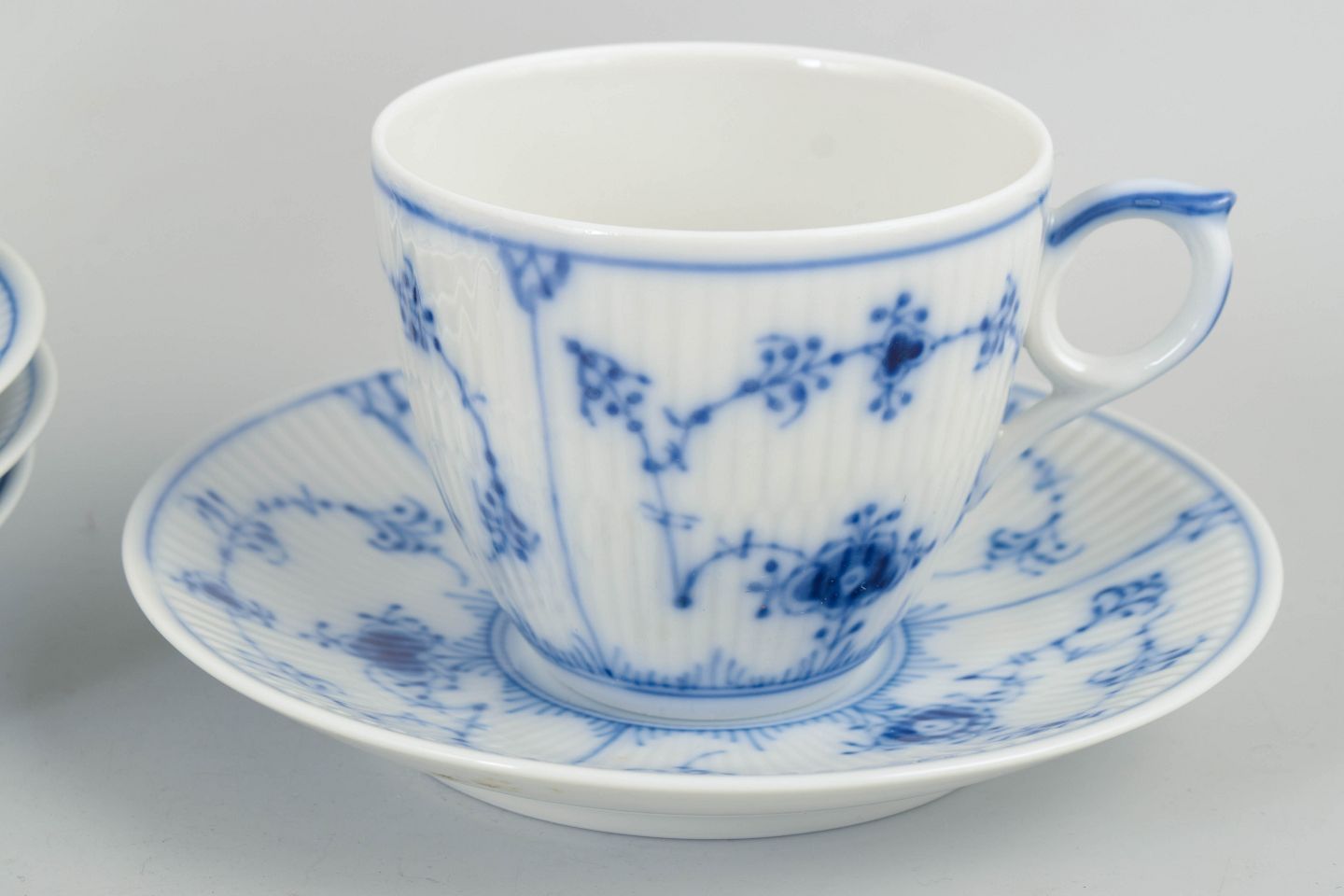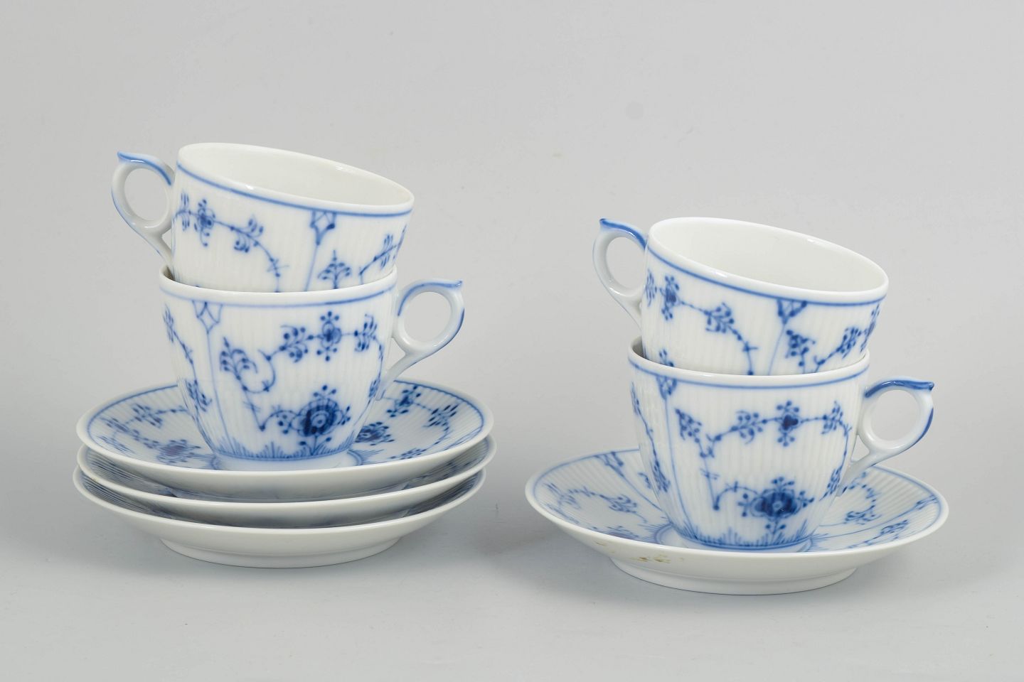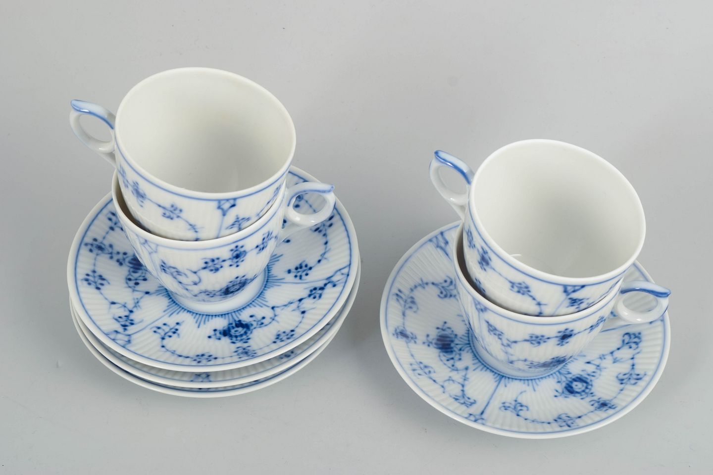 Porcelain coffee set from the Blue Fluted Plain series, consisting of cups and saucers for four persons, model 1/2162. Classic fluted form with hand-painted blue decoration.