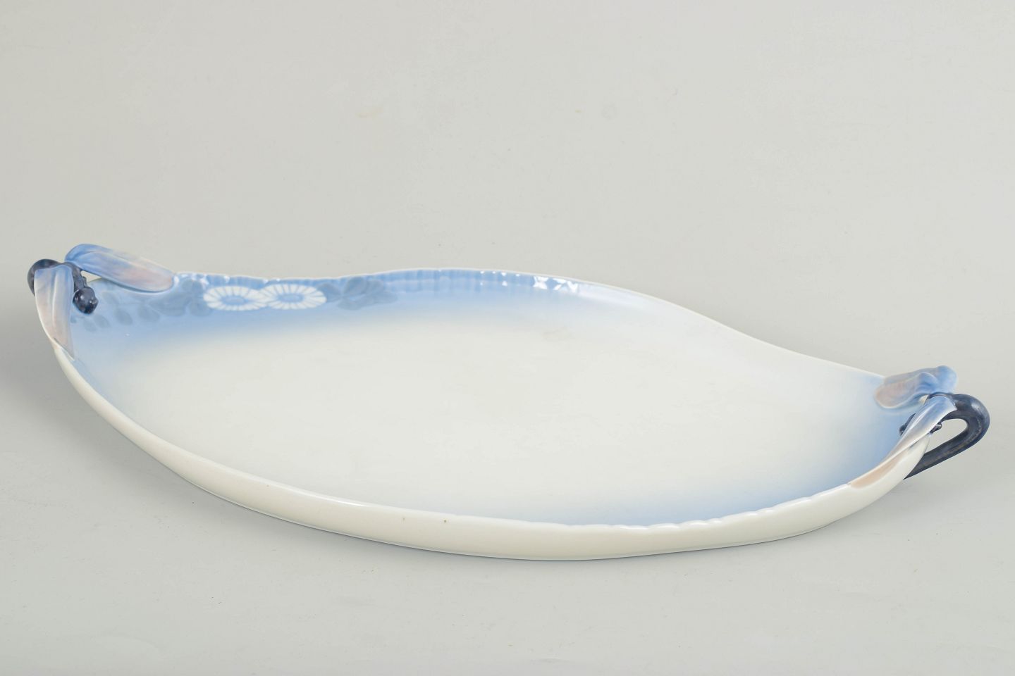 Large decorative porcelain tray from the Midsummer Night’s Dream series, model 73/10034. The tray features an elegant oval shape with integrated handles and softly graduated decoration.