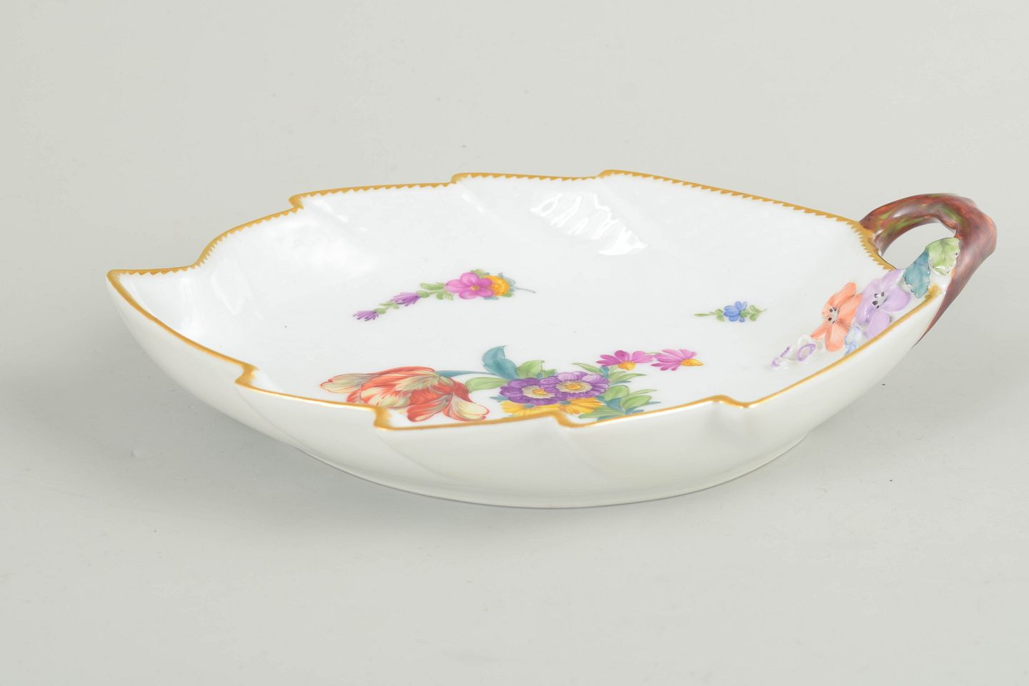 Bladformet serveringsfad i hvidglaseret porcelæn med håndmalet blomsterdekoration i serien Saksisk blomst, forgyldt kant og integreret hank; model 4/1599.
