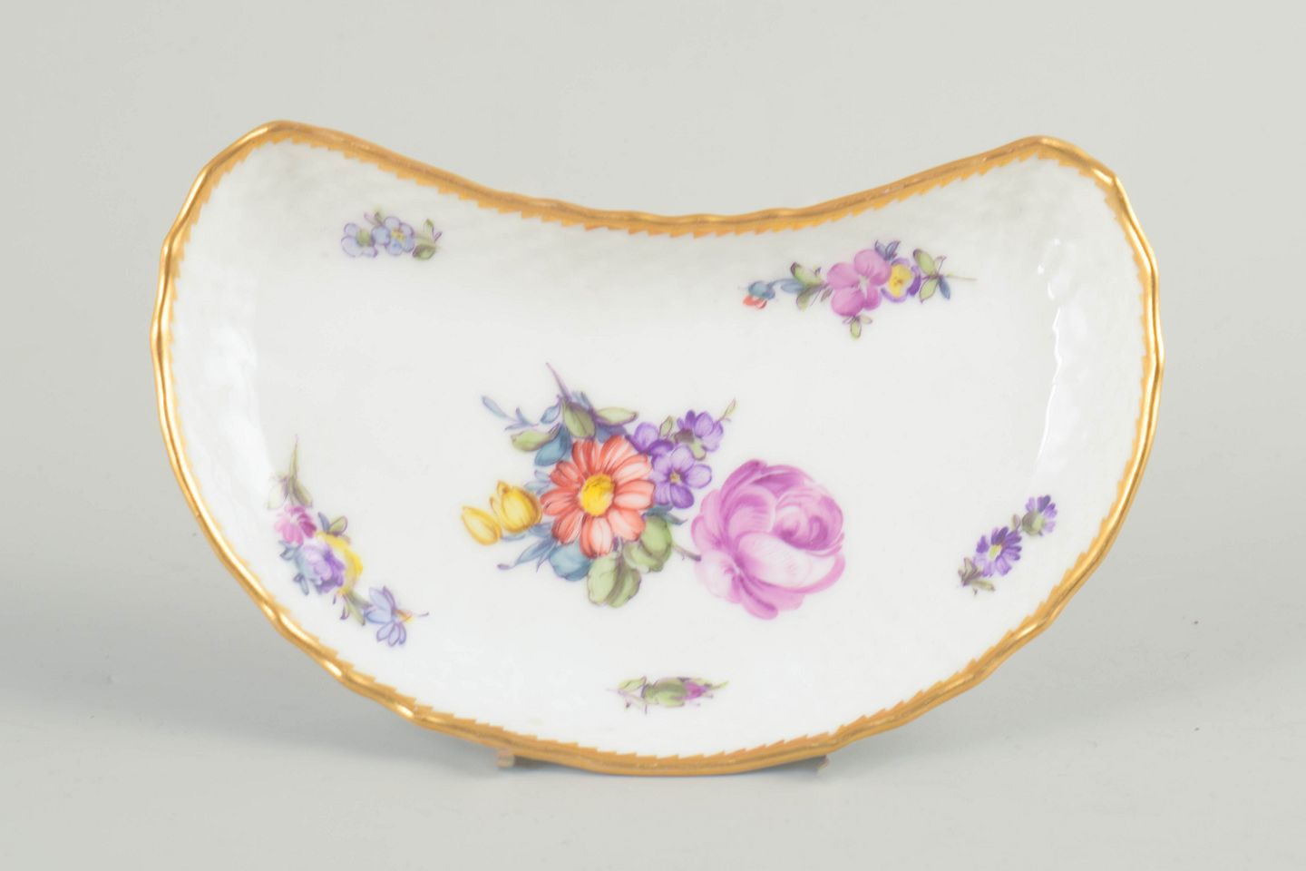 Buet fad i hvidglaseret porcelæn med håndmalet blomsterdekoration i serien Saksisk Blomst, indrammet af forgyldt kant; model 4/1466. 1. sortering, ca. 1910’erne.