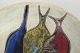 Lav, rund skål i glaseret keramik med abstraheret figurkomposition i relief, udført i dybe blå, grønne og røde toner mod lys bund. Kompositionen har et markant modernistisk udtryk med klare konturer og en malerisk glasurbehandling. Signeret på bunden “Fantoni, Italy”.