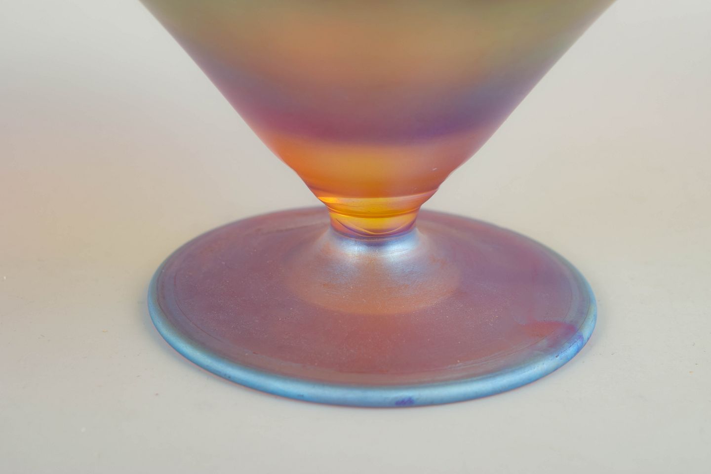 Lille fodskål i iriserende kunstglas, model nævnt i beskrivelsen, med let udsvajet kumme og lav fod; den perlemorsskinnende overflade giver et levende farvespil, karakteristisk for periodens dekorative glas.