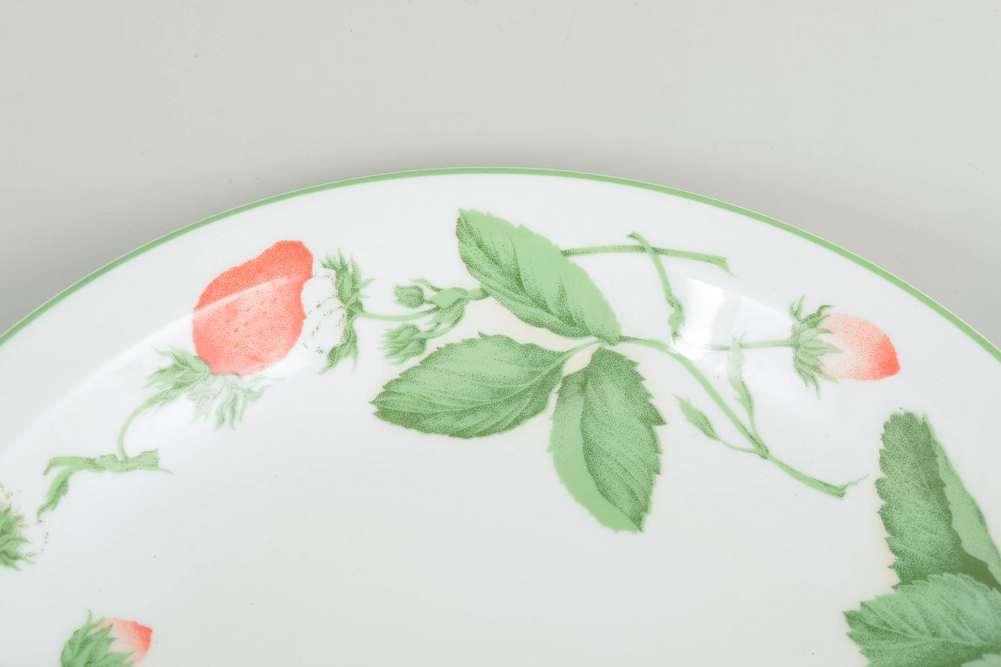 Large round porcelain bowl with strawberry and leaf decoration around the rim, from the Fraise series.