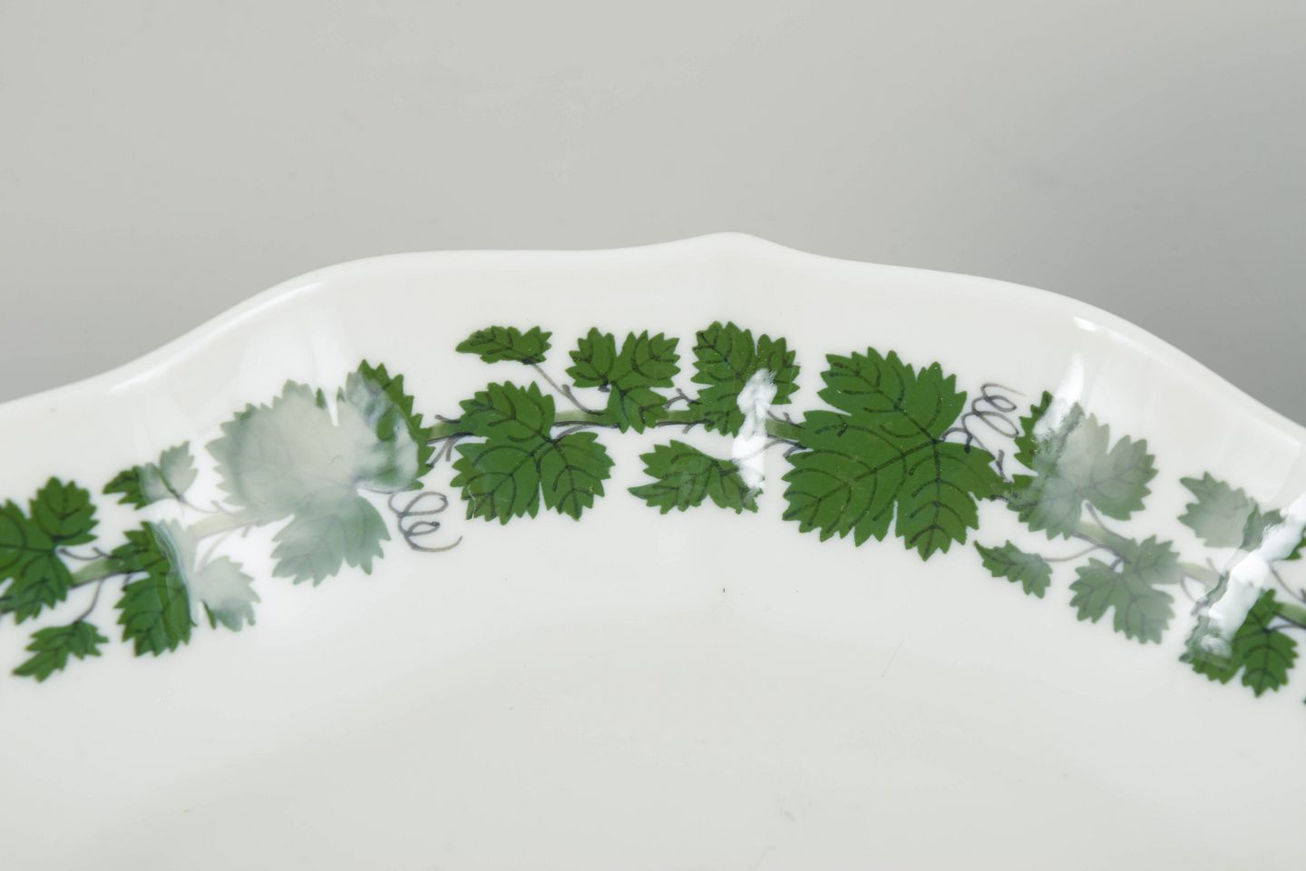 Meissen er Europas ældste porcelænsmanufaktur, grundlagt i 1710, og kendt for sit hårdporcelæn og håndmalede dekorationer. Serien med grønne vinranker og vinblade er et klassisk bordmotiv, hvor botanisk ornamentik kombineres med et rent og elegant formsprog.
