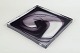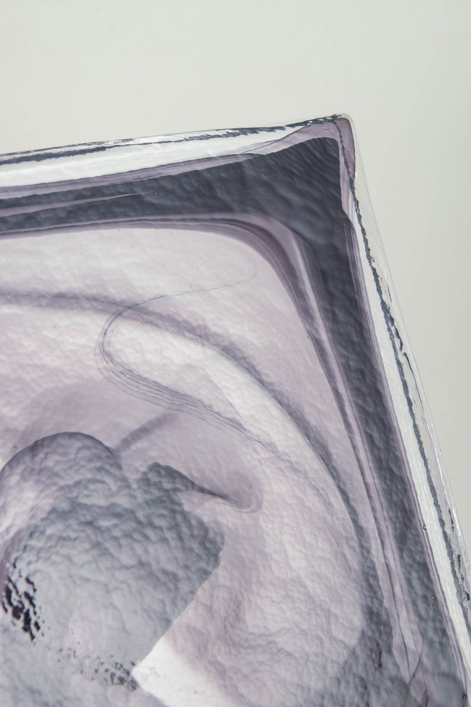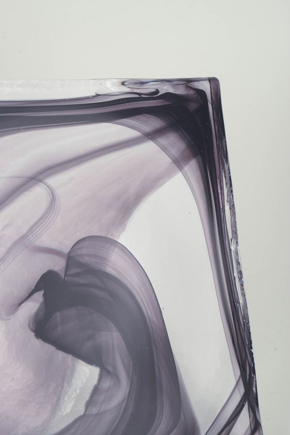 Flat, square object in clear glass with embedded swirling black and grey glass threads forming an abstract cirrus-like pattern. The model is known as Cirrus Black.
