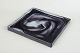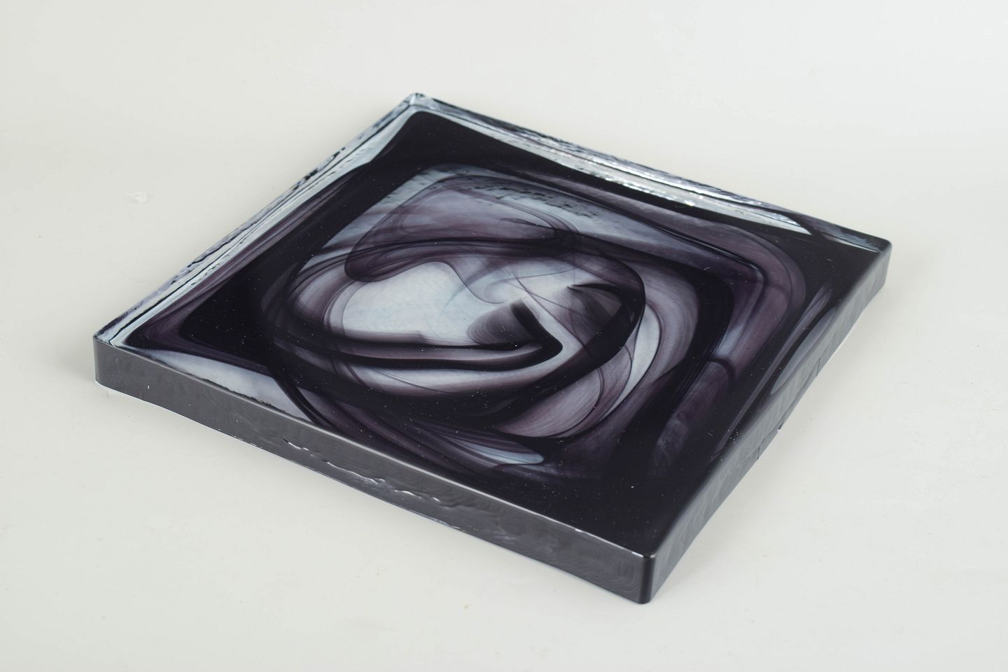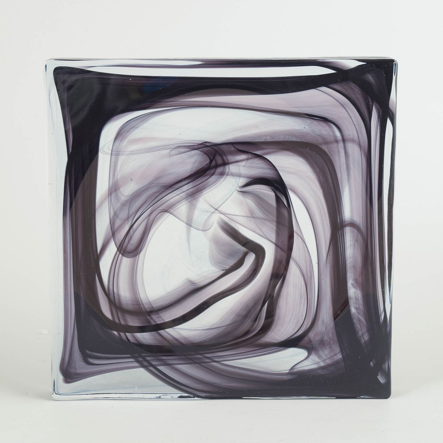 Fladt, kvadratisk objekt i klart glas med indkapslede, slyngede sorte og grå glastråde, der danner et abstrakt cirrus-lignende mønster. Modellen er kendt som Cirrus Black.