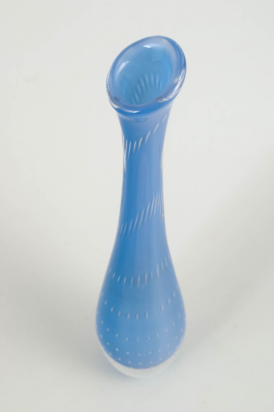 Slender vase in blue art glass with a decorative bubble pattern and optical ribbing; base engraved “LH 1336 / Kosta”.