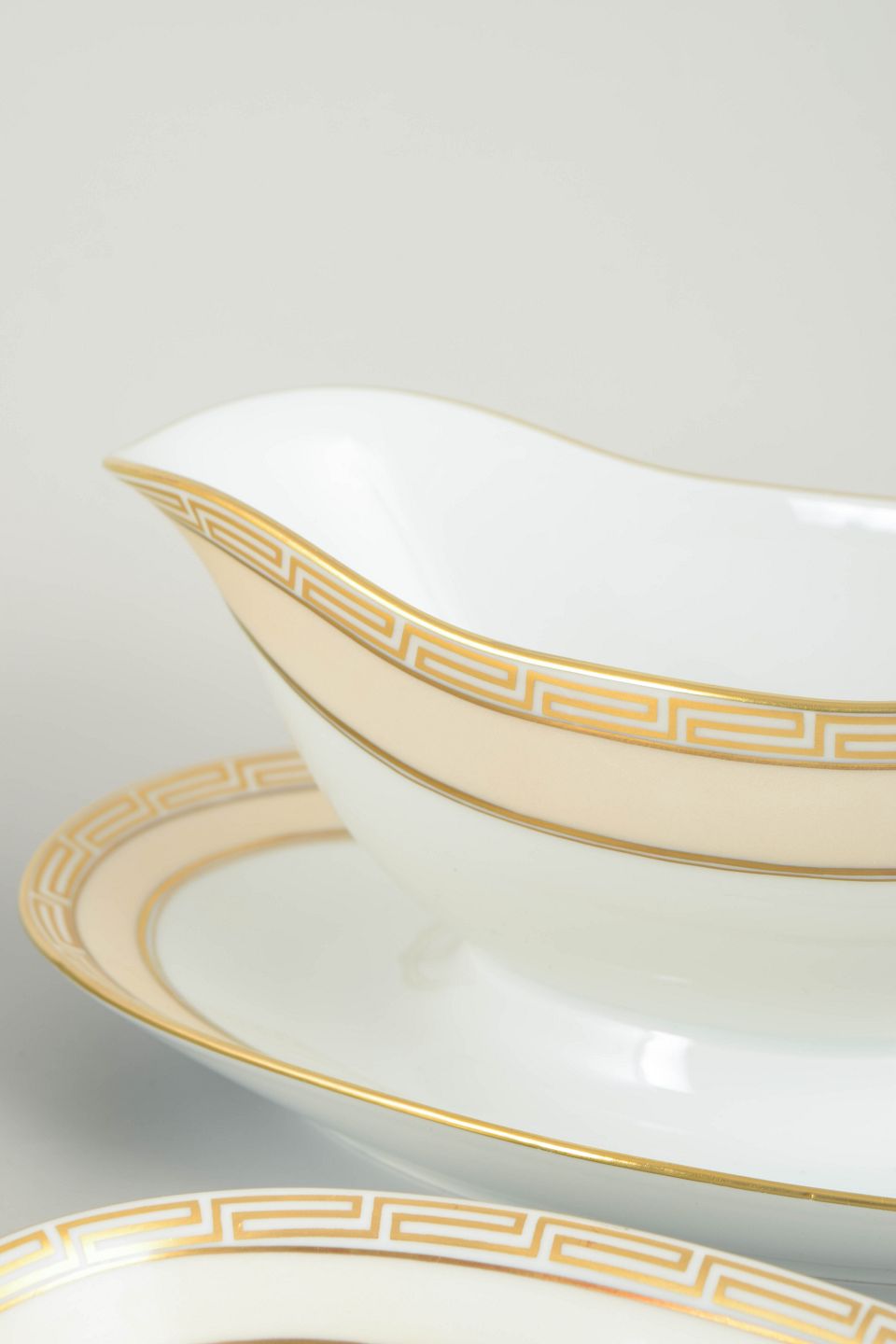 Sæt i hvidglaseret porcelæn med forgyldt kant og geometrisk bort i art deco-stil; modeller 317 og 316.