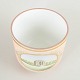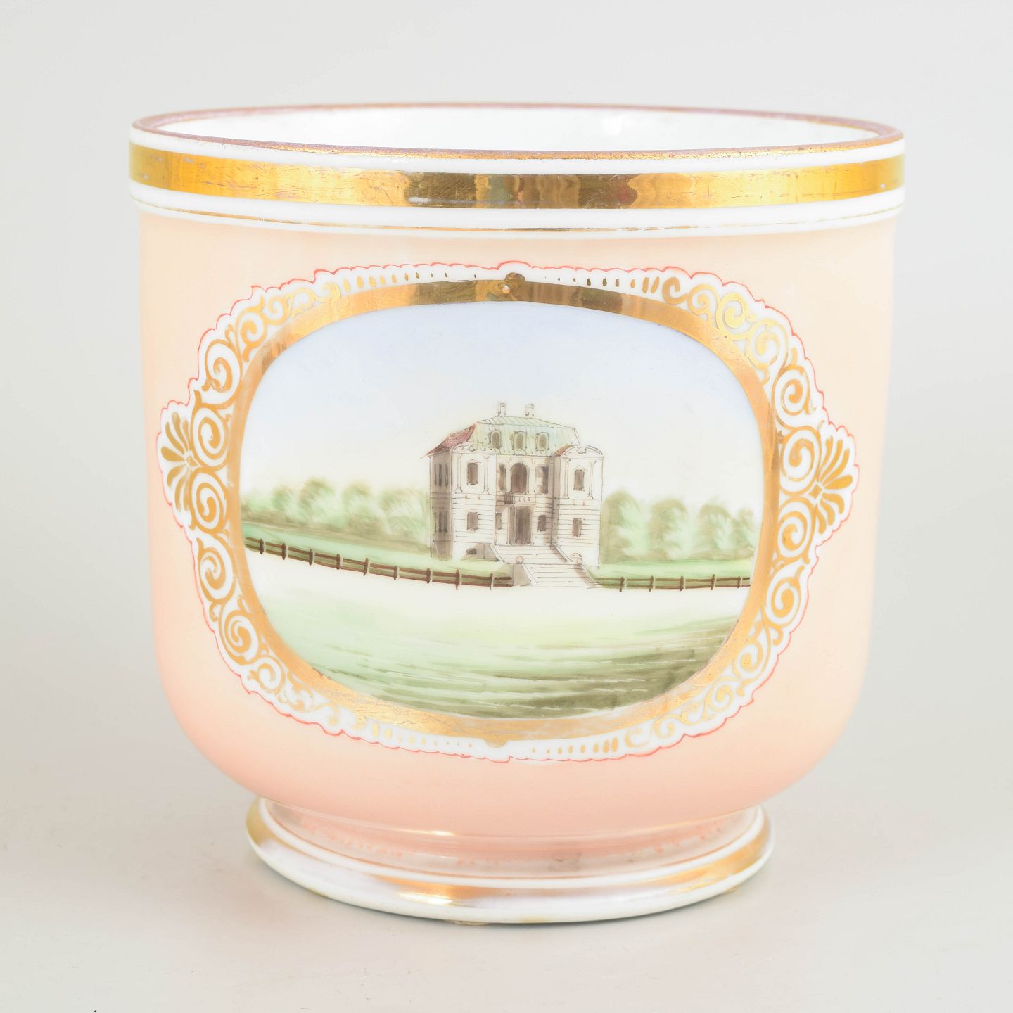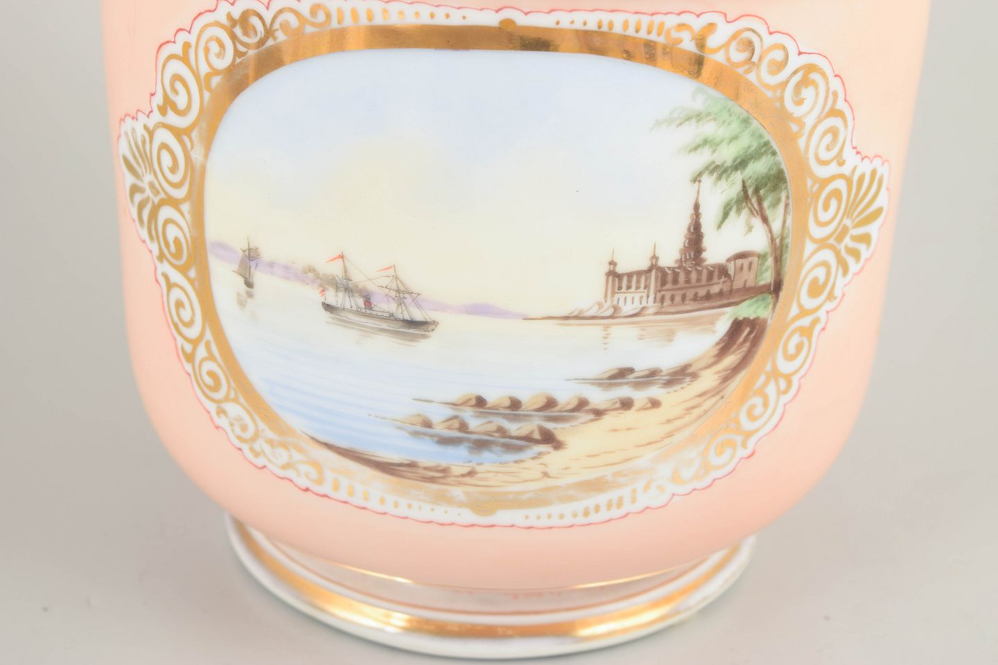 Round, slightly conical porcelain vase with an opalescent pink ground and a hand-painted view of the Hermitage Palace and Kronborg Castle within an ornamented cartouche, finished with a gilded border along the rim. The form is inspired by Classicism and features a low foot. The motif is executed in fine pastel tones with detailed architectural elements.