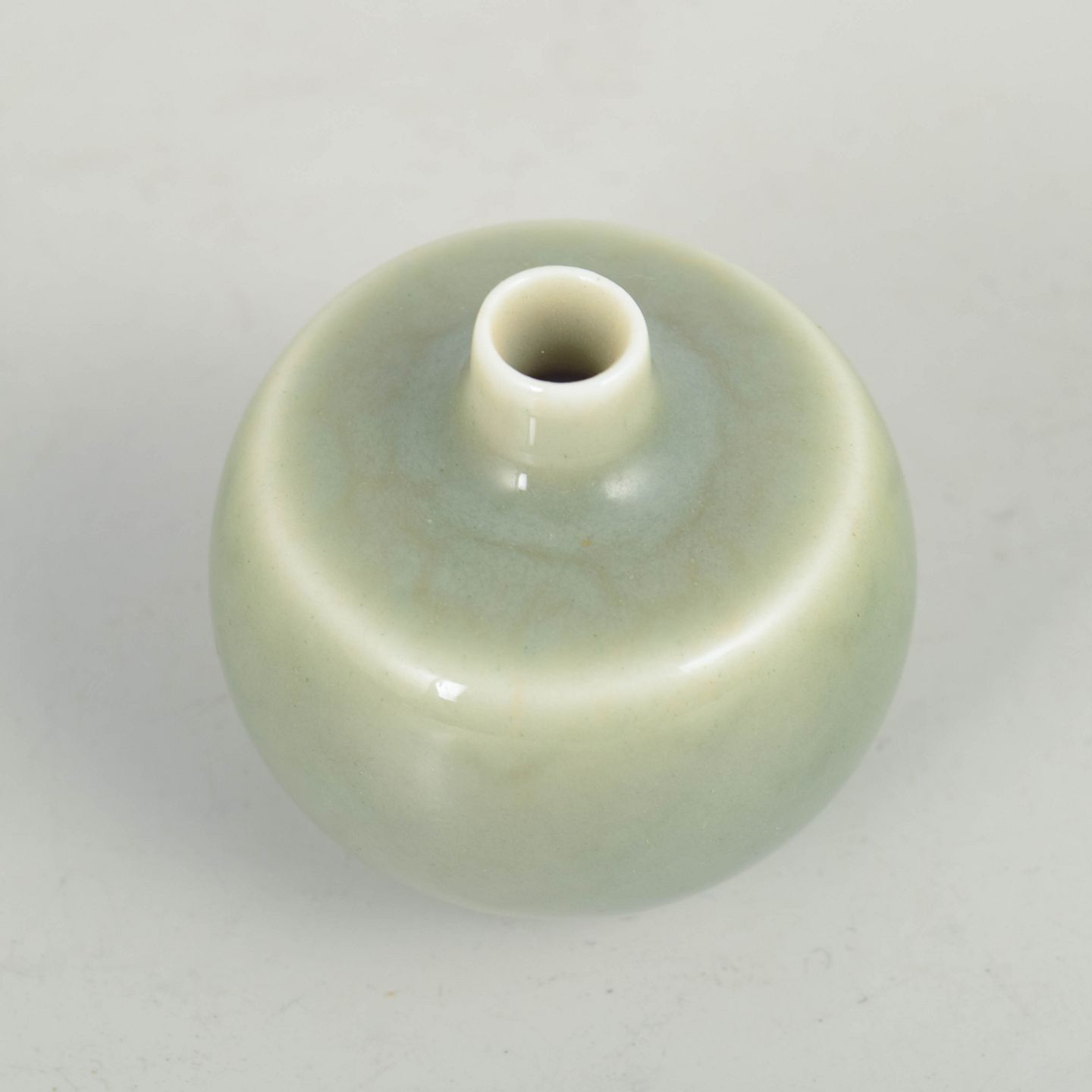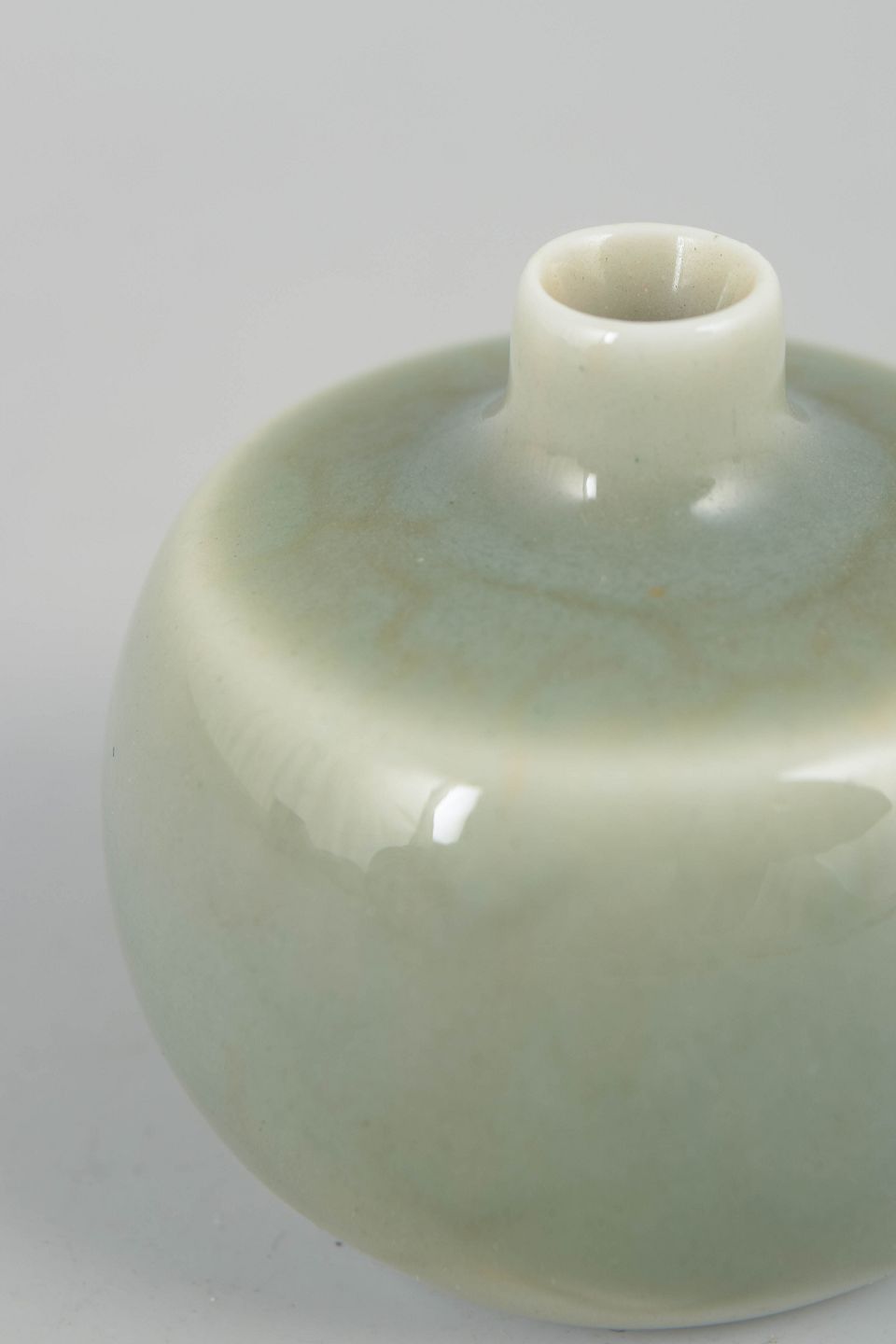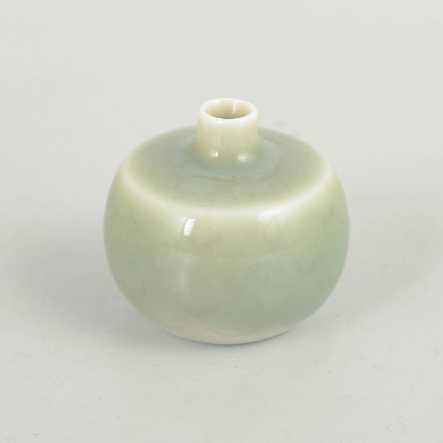 Small rounded stoneware vase with a softly curved form and monochrome celadon glaze in a pale green tone. The glaze shows subtle tonal variations and a calm surface typical of Stålhane’s restrained and harmonious design language.