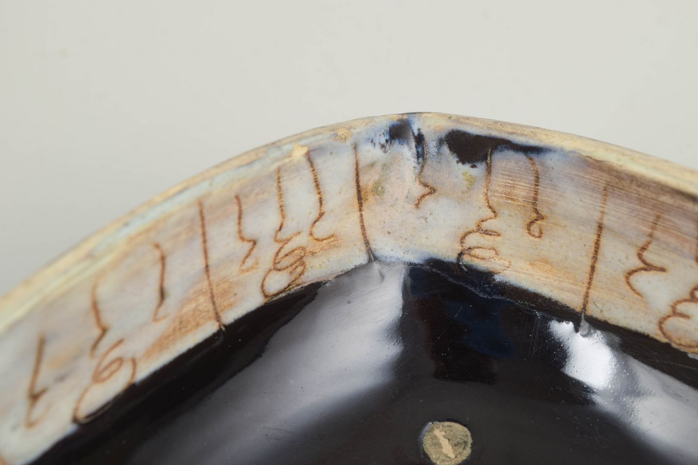 Organically shaped ceramic bowl with an asymmetrical, slightly faceted rim. Dark glossy glaze to the exterior and a light interior with brown drip effects and a fine crackled appearance.