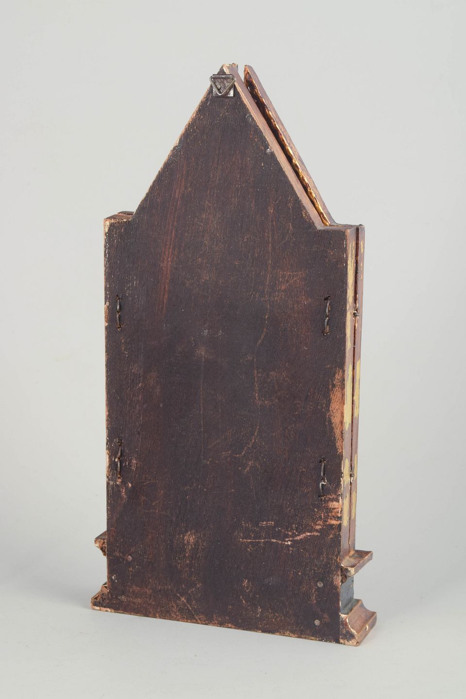 Folding triptych with a central icon of the Madonna and Child, flanked by saint figures on the wings. Painted on wood with a gilded, ornamented frame.