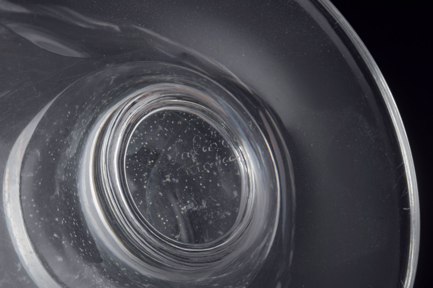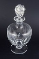 Stor og sjælden vinkaraffel i klart formpresset glas med reliefsleben korpus og knop formet som drueklase. Modellen “Clos Vougeot” er udført med klassisk Art Deco-inspireret symmetri og elegante facetter, der reflekterer lyset og fremhæver glassets klarhed. Signeret i bunden.