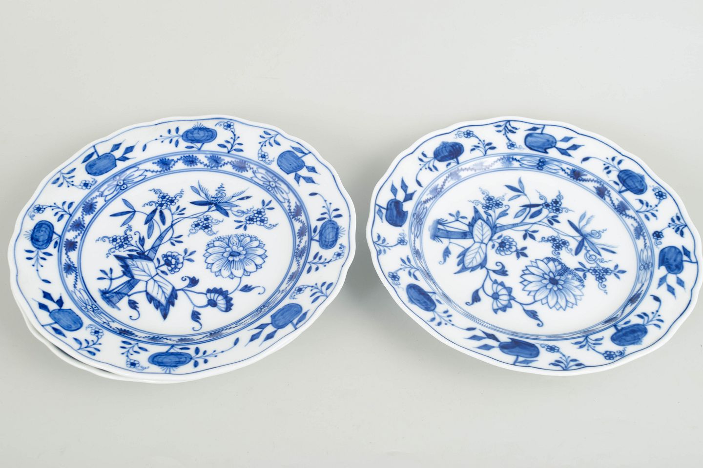 Dinner plates in white porcelain decorated with the underglaze blue Blue Onion pattern and a scalloped rim. Marked to the base with the Meissen crossed swords.