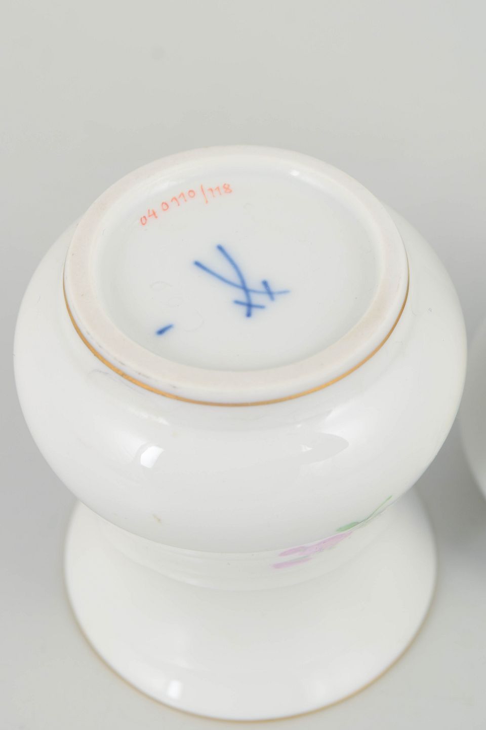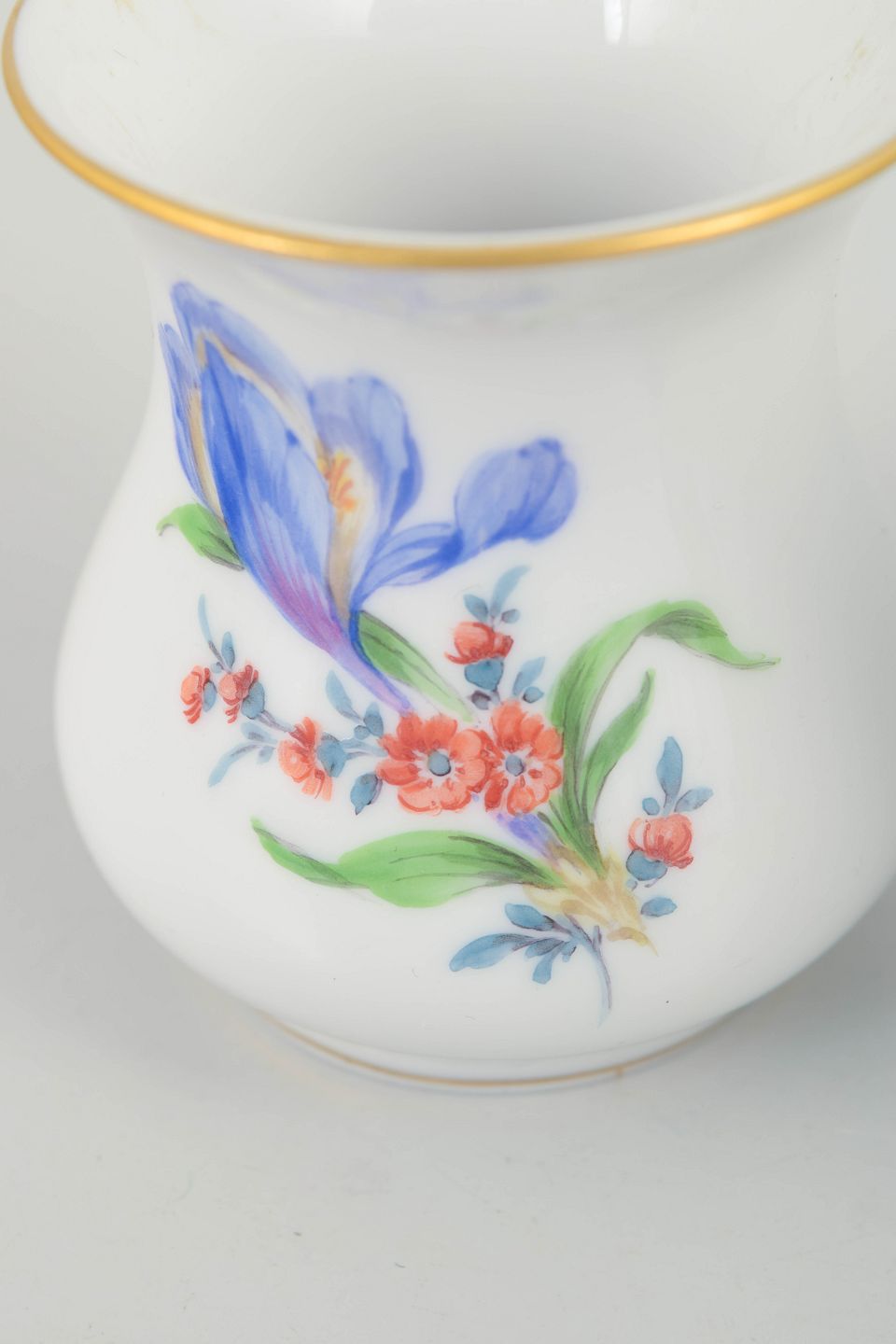 Small baluster-shaped miniature vases in white porcelain, decorated with hand-painted polychrome floral bouquets and finished with a gilt rim. Marked to the base with the Meissen crossed swords.