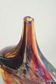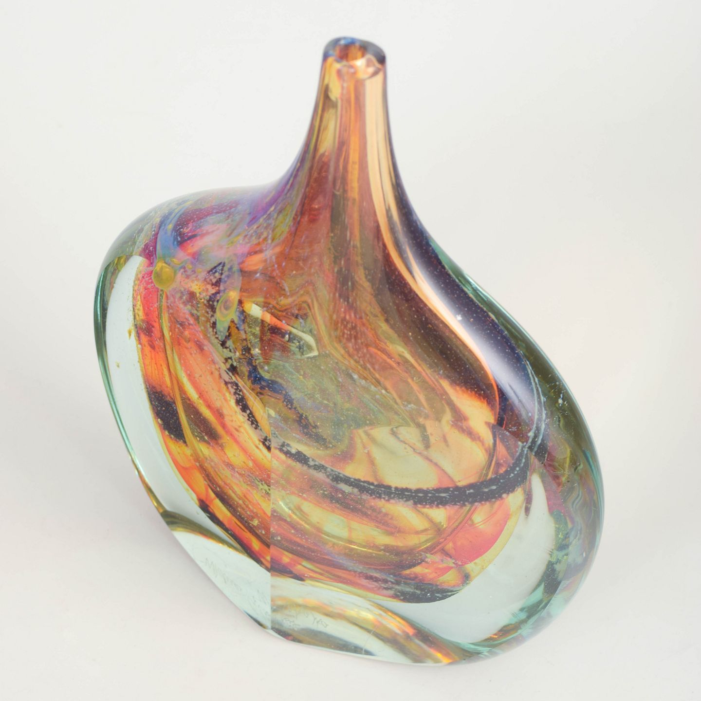 Organisk formet kunstglasvase i kraftigt, mundblæst glas med indkapslede, hvirvlende farver i rav, orange og mørke kontraster, afsluttet med klart ydre lag. Frit opbygget, asymmetrisk form med markant tyngde i bunden. Signeret under bunden Mdina glass, Malta”.