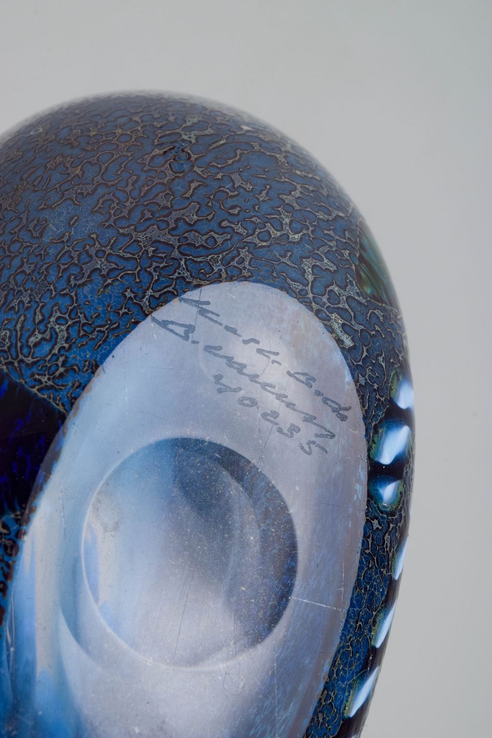 Organically shaped art glass vase in mouth-blown blue-toned glass with fused decorative elements and a lightly crackled surface texture. Model number 40235 is engraved to the base along with the signature.