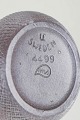 Elegant kande i stentøj med gråviolet, fint tekstureret overflade og reliefdekoration med stiliserede blade i lyse turkise og hvide toner. Organisk, slank form med integreret hank. Modellen er stemplet i bunden og bærer modelnummer 4499.