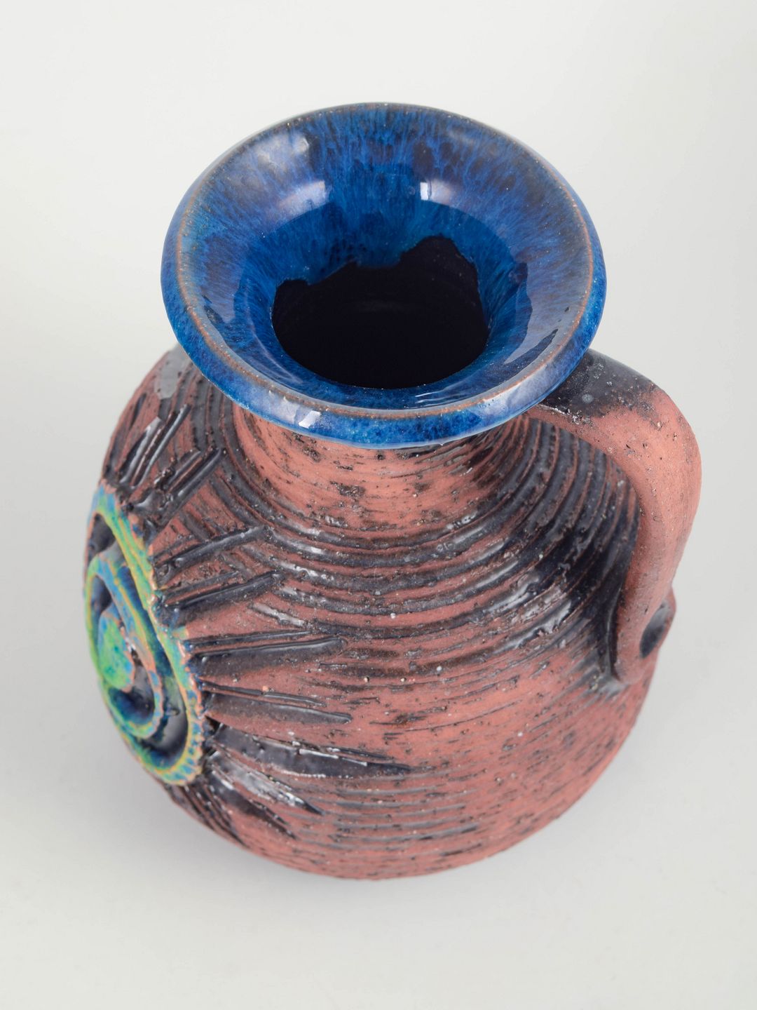 Organically shaped pitcher in thrown stoneware with a coarse, rustic surface in reddish-brown tones and a decorative relief with a circular motif in blue and green glazes. Model 193.