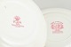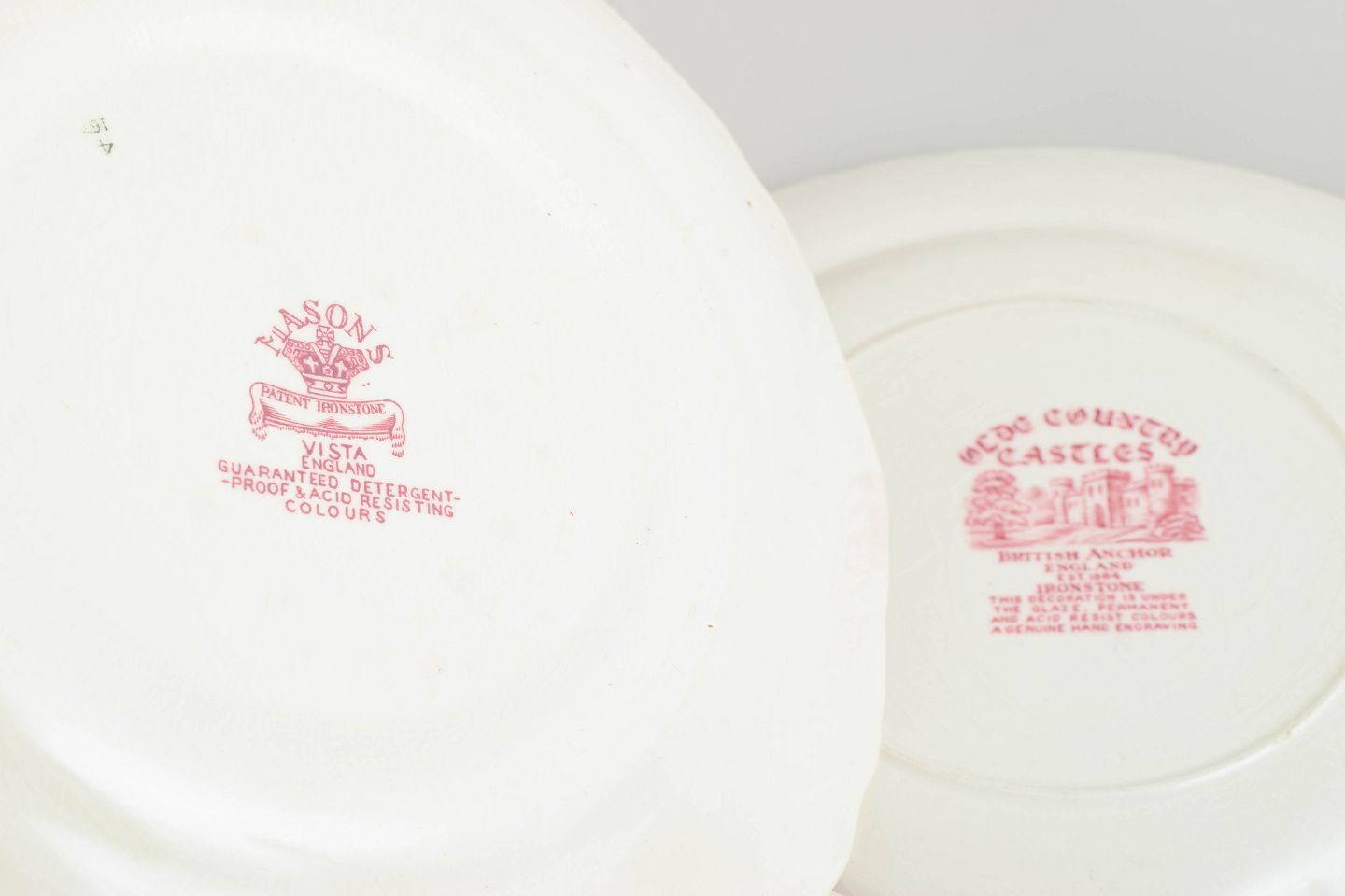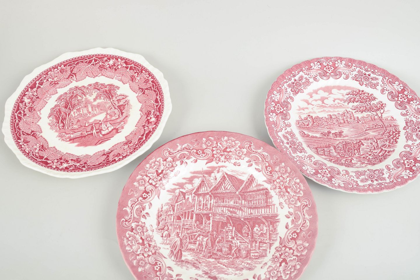 Faience dinner plates by English makers, decorated in red transferware with landscape and ornamental motifs.